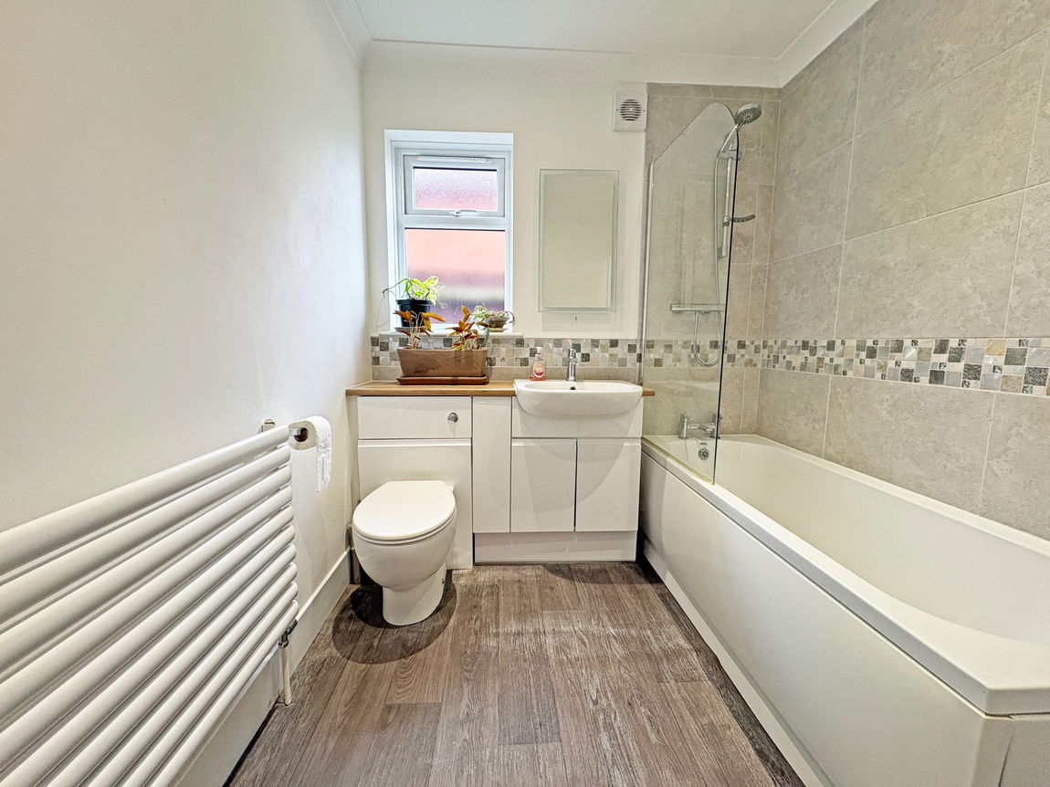 Having window unit to the side elevation, coving to the ceiling, downlights, extractor, heated towel rail radiator, tall white gloss fitted bathroom unit, panel bath with mains fed shower and screen, vanity wash hand basin, concealed system wc.