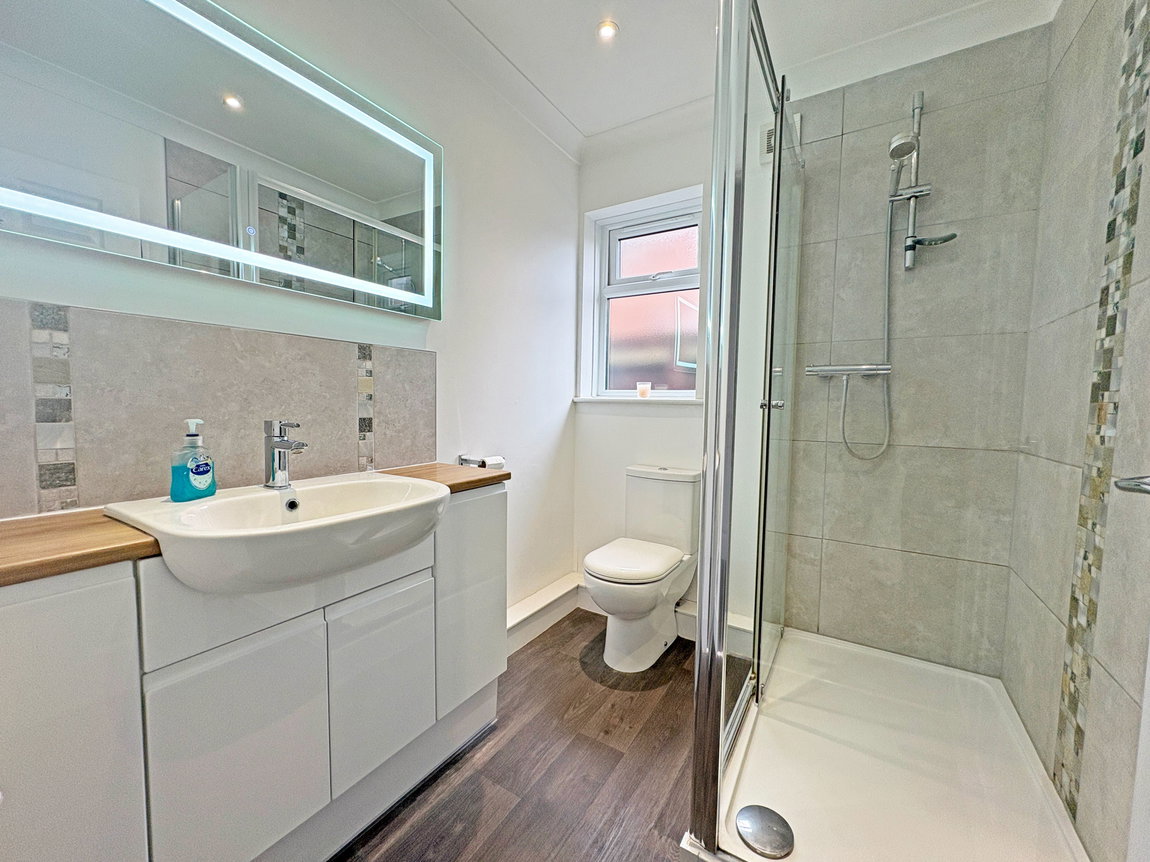 Having window to the side elevation, dual flush wc, vanity wash hand basin, coving to the ceiling, downlights, double shower enclosure with mains fed shower.