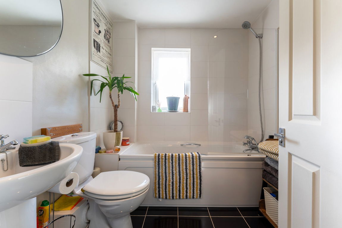 Upstairs, the property continues to impress with two bedrooms, both light and airy, along with a stylish family bathroom featuring a modern three-piece suite, shower over bath and a sleek chrome towel radiator.