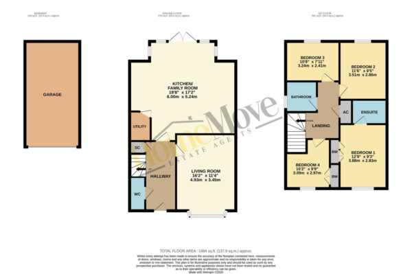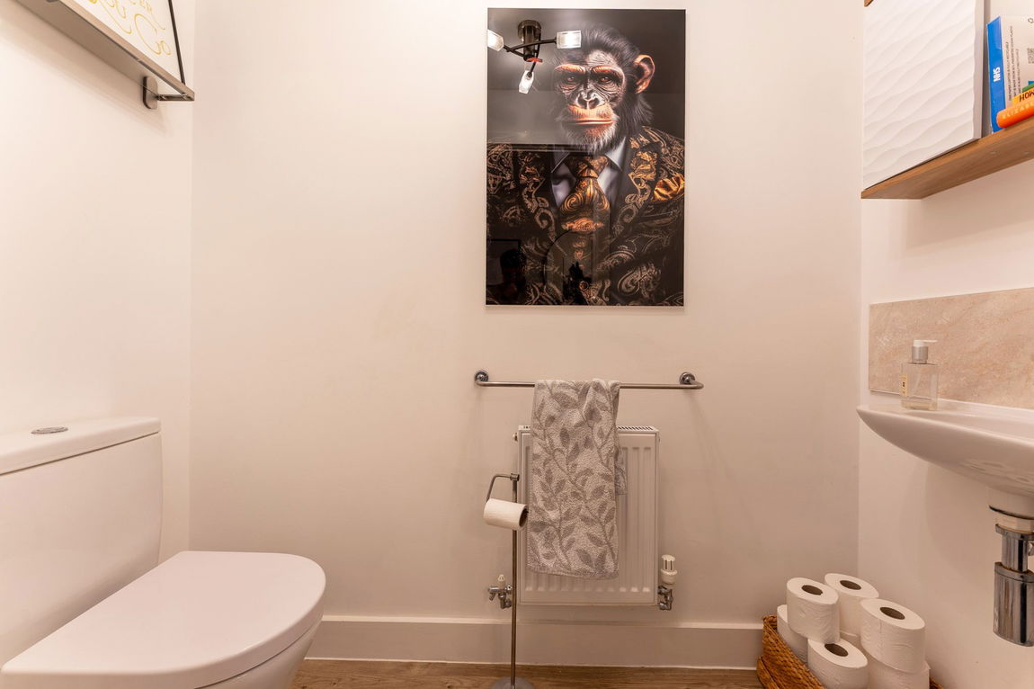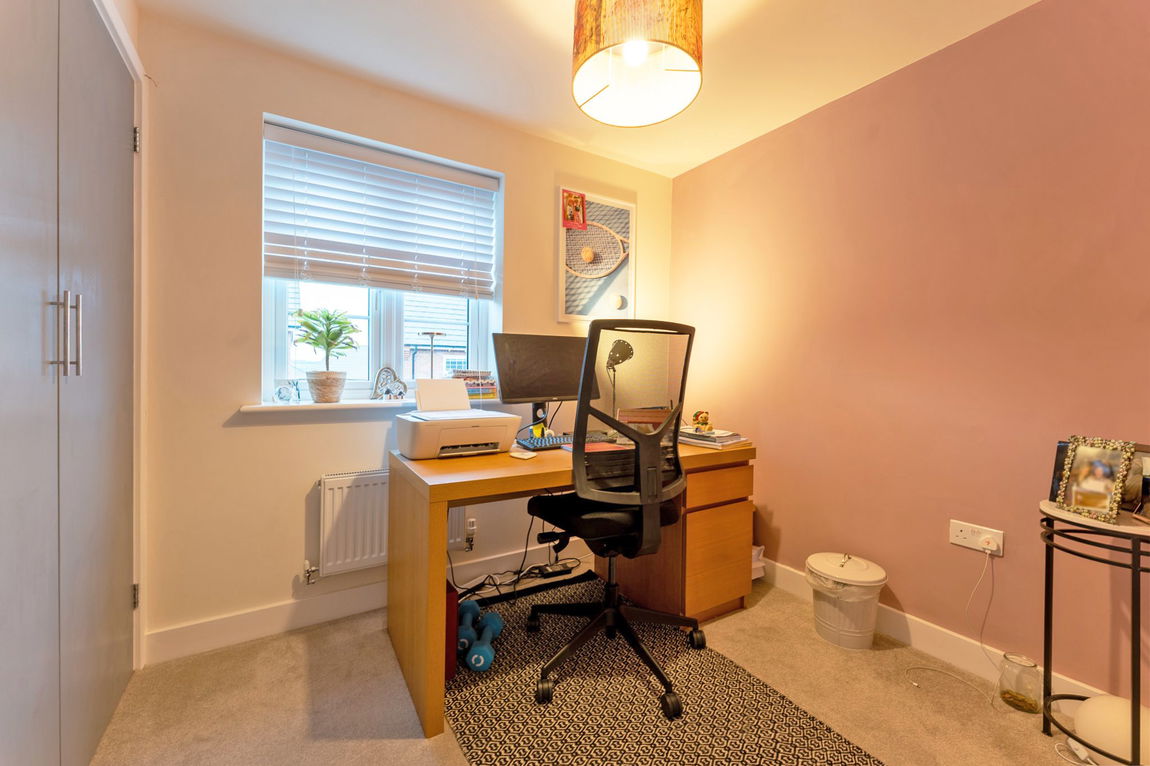 Upstairs, a generous and naturally lit landing leads to four beautifully presented bedrooms, all finished to an exceptional standard. The main bedroom features fitted wardrobes and a luxurious en-suite shower room, complete with elegant tiling, walk-in shower, and contemporary fixtures. Two further double bedrooms overlook the garden, while the fourth bedroom is perfect for use as a study or single room, benefitting from integrated storage. A modern family bathroom with bath and overhead shower serves the remaining bedrooms.
