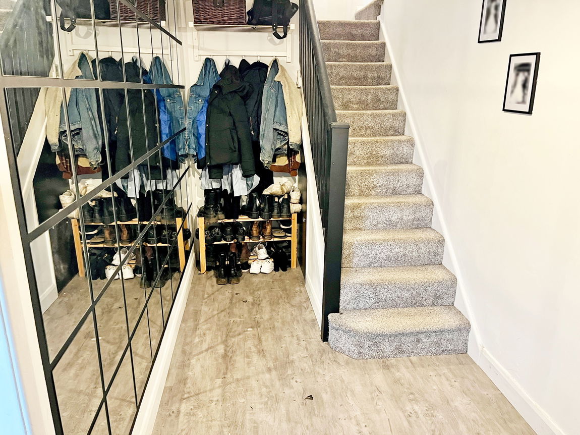 The hall has stairs rising to the first floor and a built in storage cupboard.