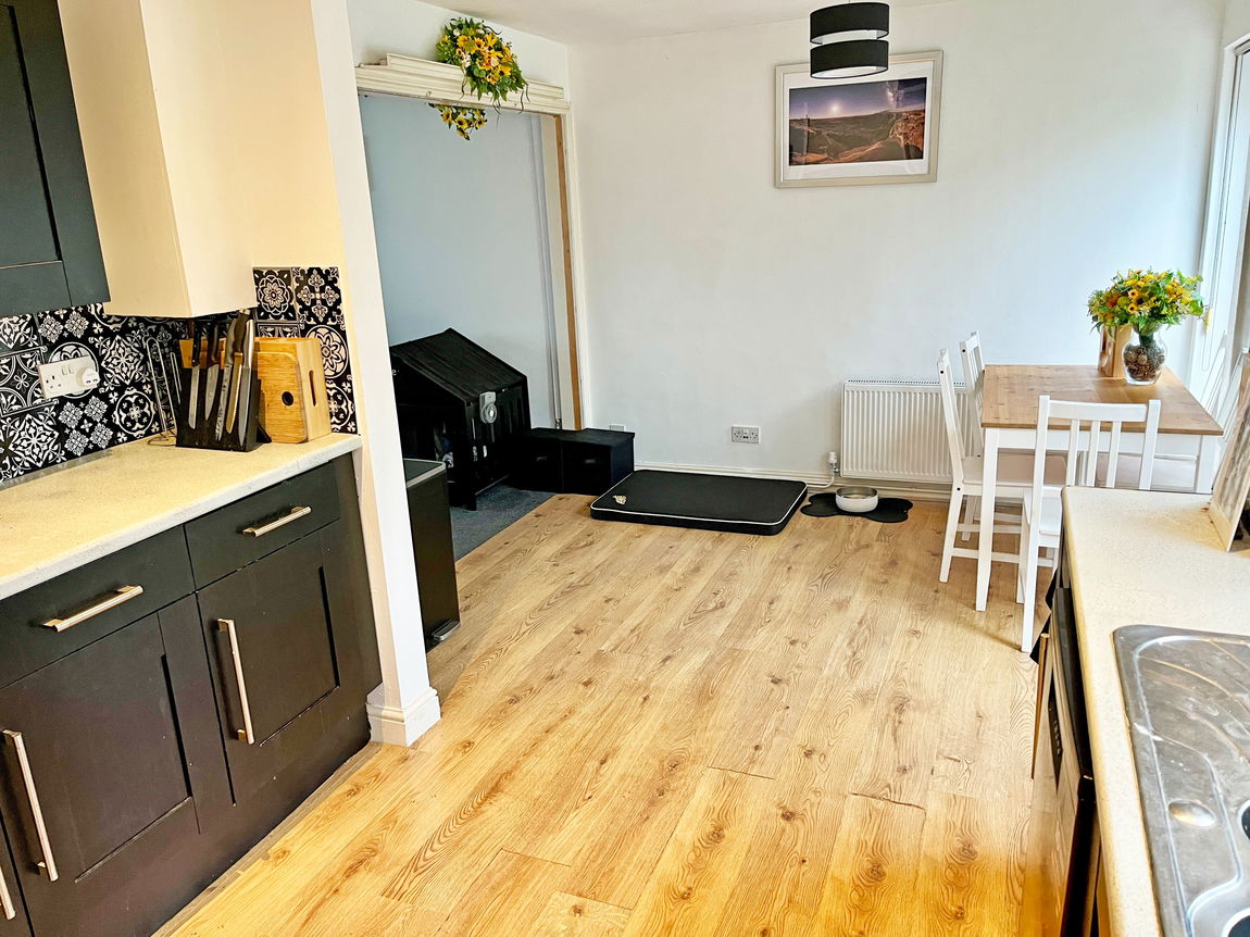 The dining/kitchen, has a range of built in wall and base units with work surfaces over, one and a half sink and drainer unit withy mixer tap, tiled splashbacks, electric hob, electric oven and grill, plumbing for a dishwasher, built in pantry, wood effect flooring, space for a family dining table, double glazed patio doors leading to the rear garden and a door leading to the utility room.