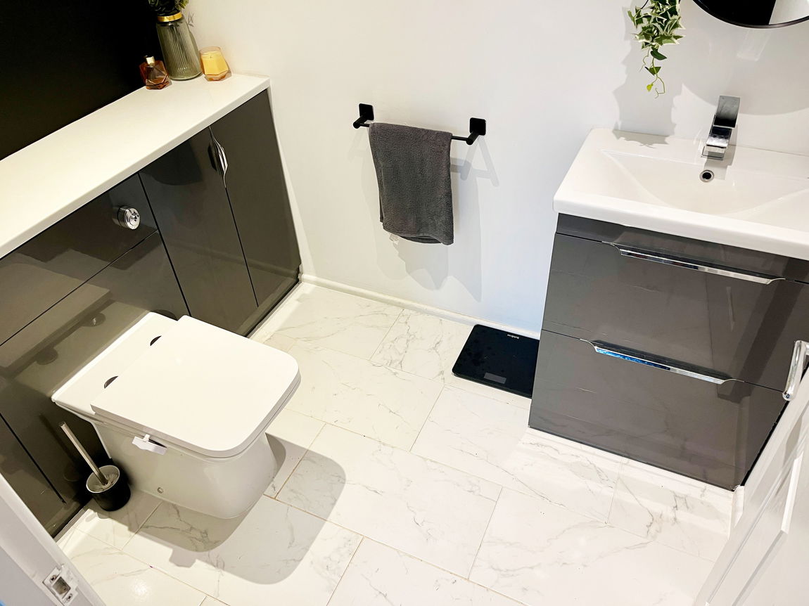 The downstairs is fitted with a modern suite comprising of, a wc with concealed cistern with built in storage, wash hand basin in a vanity unit with built in storage under.