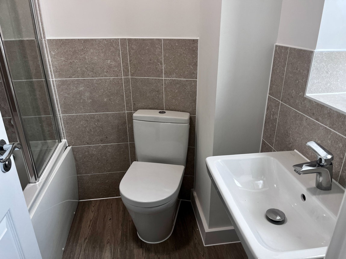 The bathroom is fitted with a white three-piece suite including a bath with a shower over.