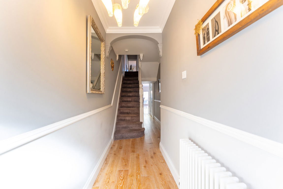 Step through the welcoming entrance hall, where classic details and natural light set the tone for the home. The ground floor is centred around a stunning 28ft lounge/diner, featuring rich oak flooring, elegant bay window, and a charming multi-fuel burner - perfect for relaxing or entertaining. Double doors open onto the private, low-maintenance rear garden, providing seamless indoor-outdoor living. A convenient downstairs WC is tucked beneath the stairs.