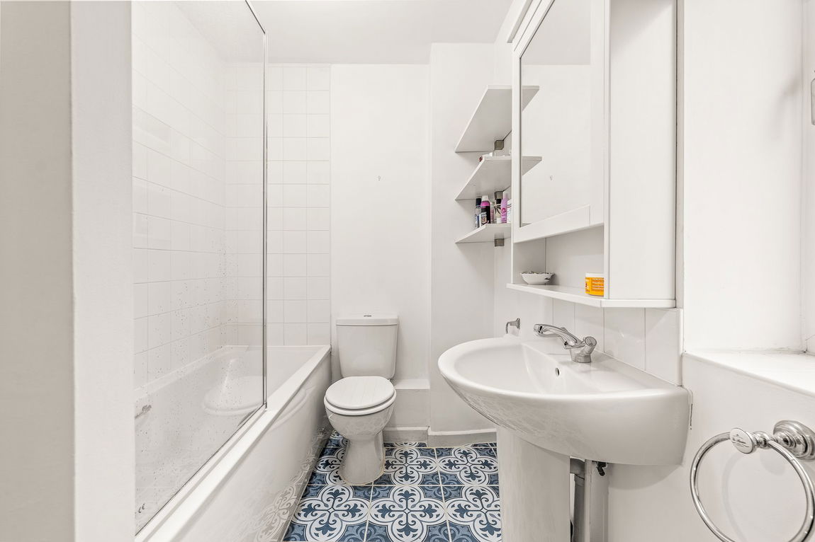 The bathroom features a three-piece suite, including a bath with an overhead shower, wash hand basin, and WC, all elegantly designed and functional.
