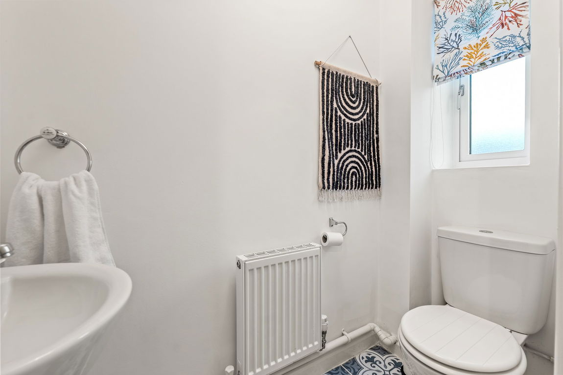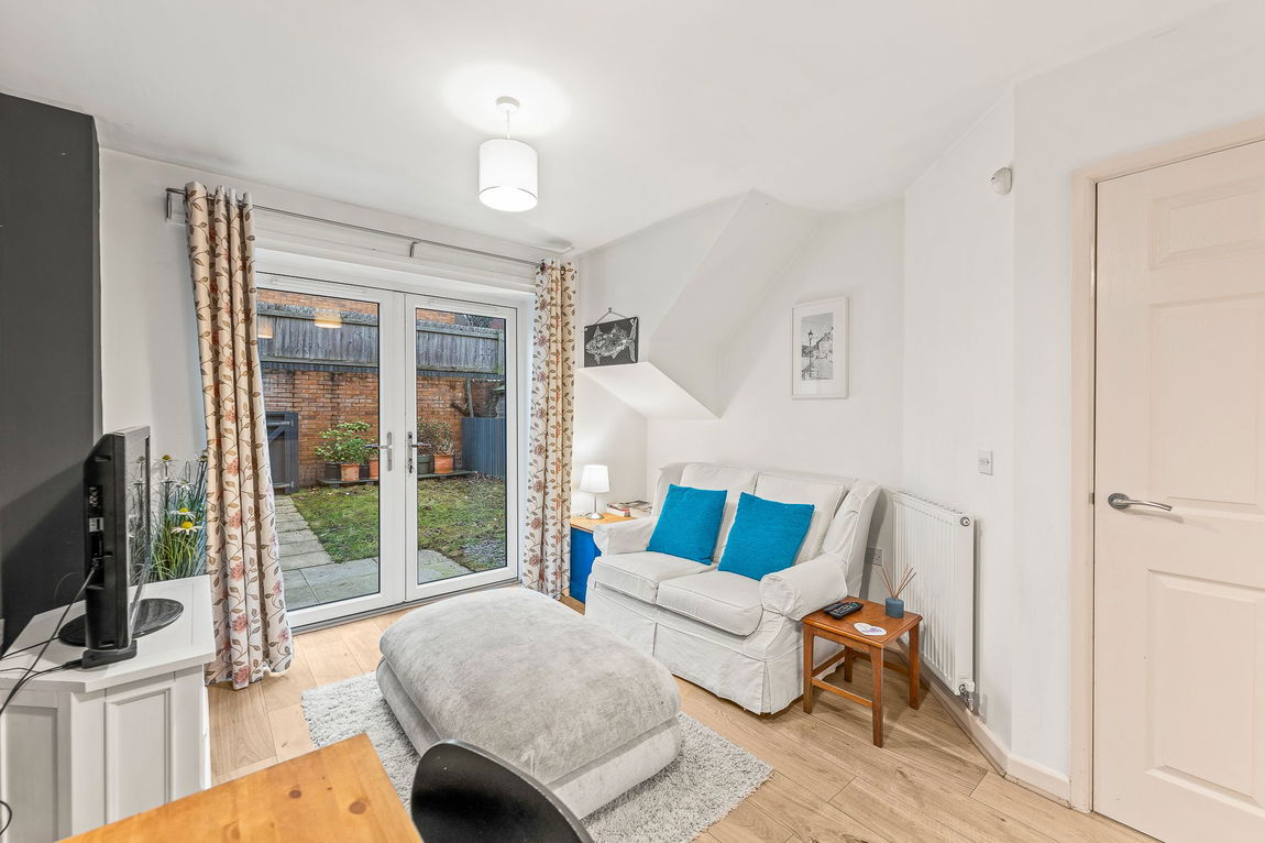 Transitioning into the lounge and dining area, you’ll find room for both a dining table and plush seating, perfect for gatherings with family and friends. French doors access the back garden, offering a picturesque view and seamless integration between indoor and outdoor spaces. To your right, the conveniently located downstairs WC provides both comfort and functionality, complete with a wash hand basin and a window that offers ventilation and brightness.