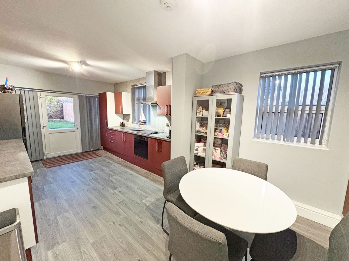 Dining Kitchen: Having two window units to the side aspect, upvc entrance door and window to the rear elevation, radiator, cupboard housing the wall mounted gas fired central heating boiler, wooden effect floor covering, fitted kitchen units comprising base cupboards, drawers and wall mounted units, working surface, insert sink with mixer tap, four ring gas hob with oven below, space for fridge freezer.