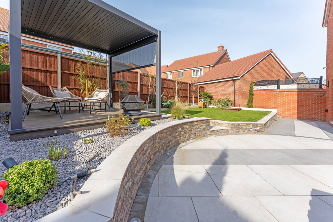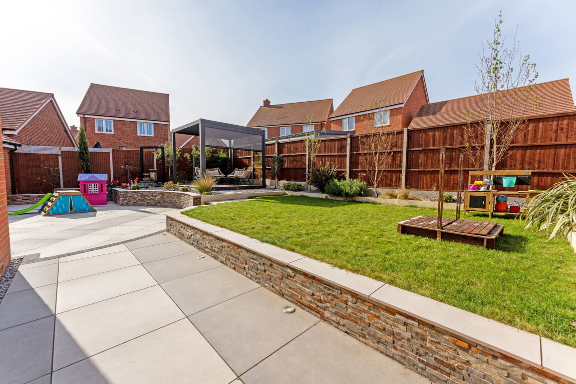 The rear garden has been expertly landscaped to create a private and versatile outdoor sanctuary. Designed with both relaxation and entertaining in mind, it features a generous paved patio ideal for al fresco dining, a raised lawn providing space for family enjoyment and a selection of mature planting that enhances privacy. A stylish decked seating area completes the space - perfect for unwinding or hosting in a beautifully finished setting.