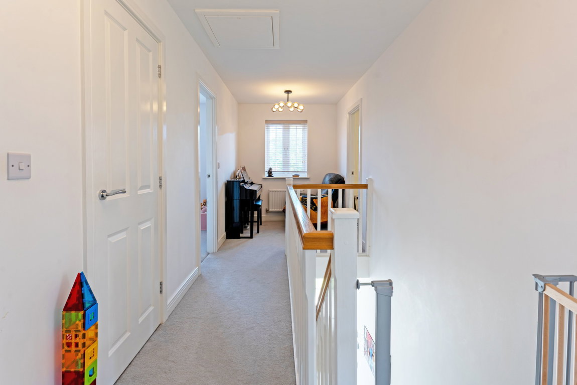 Upstairs, the property continues to impress with four generously proportioned double bedrooms. Two benefit from stylish en-suite facilities, while a contemporary four-piece family bathroom serves the remainder. The principal bedroom is a true highlight, enjoying rear garden views and featuring fitted mirrored wardrobes for a sleek, practical finish. A notably spacious landing enhances the overall sense of openness and offers further potential for additional use.