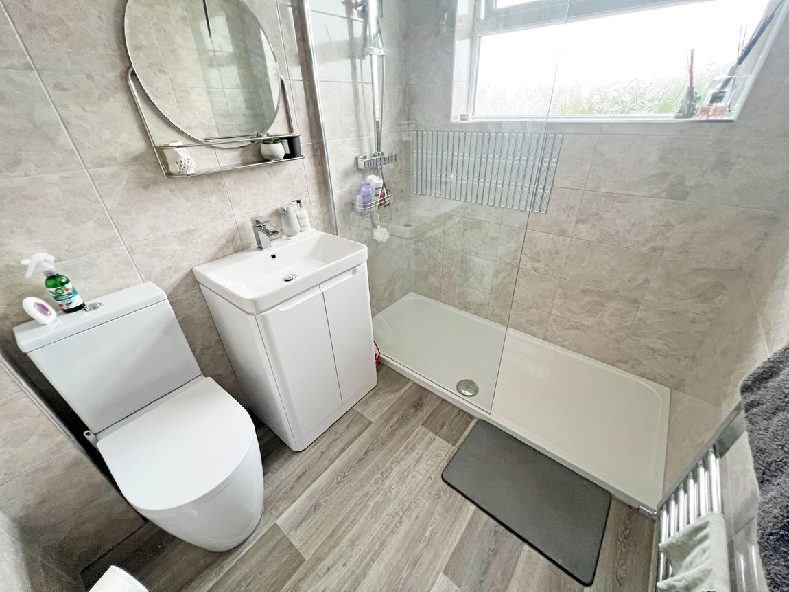 The first-floor landing provides access to all three bedrooms, and each benefits from having built-in storage. The family shower room completes the upstairs accommodation and has recently been refurbished by the current owners with an ultra-modern feel, having a walk-in shower, a wash hand basin, and a low-level flush WC.