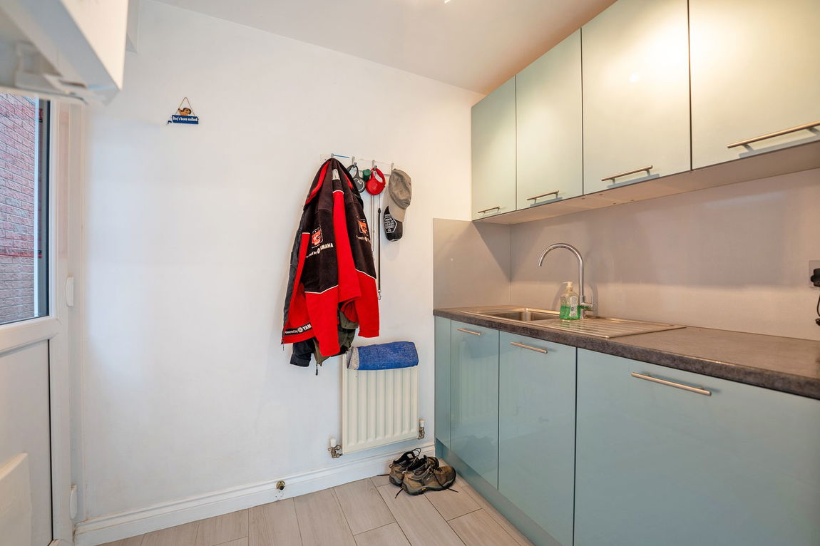The modern kitchen will impress keen cooks, boasting a sleek range of fitted wall and base units, practical upstand wall panels, and cutting-edge appliances including a Neff single oven with slide-and-hide door, Neff combi oven/microwave, AEG induction hob, and integrated fridge, freezer, and dishwasher. French doors provide direct access to the rear garden, while an adjacent utility room offers additional matching units, integrated washing machine, and a side door for convenience.