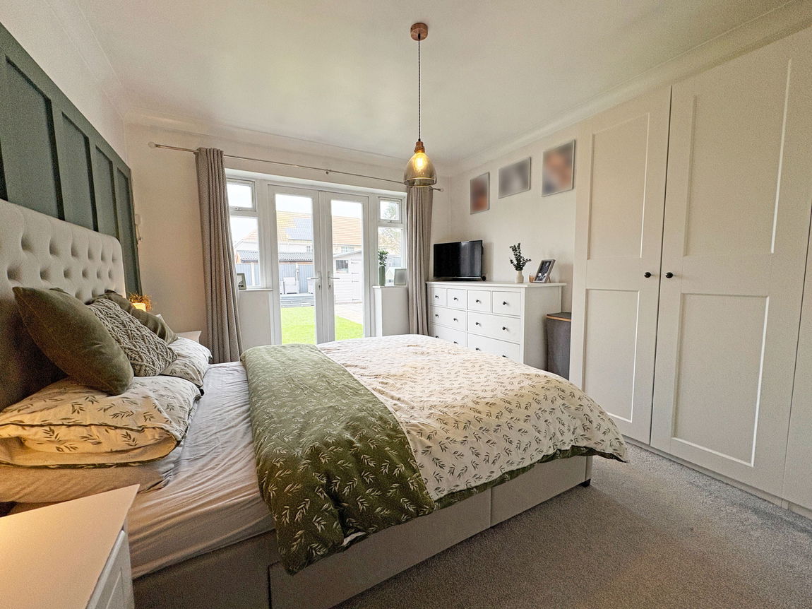Bedroom One: With upvc French doors to the rear garden, coving to the ceiling, radiator.