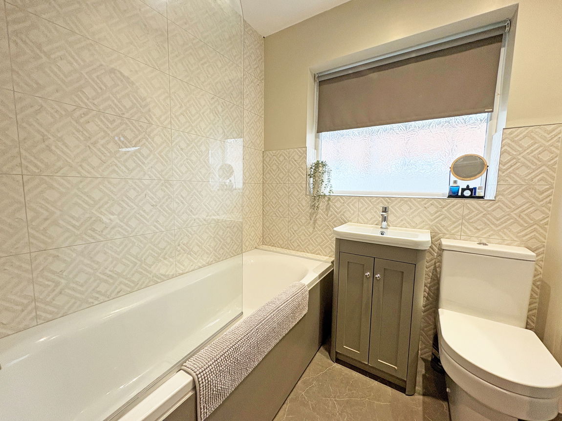 Bathroom: With access to the roof space, downlights, extractor, part tiled walls, chrome effect towel rail, dual flush WC, pedestal wash hand basin, panel bath with mixer tap and mains fed shower above with rainwater and handheld attachments.