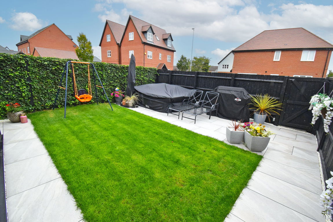 Outside to the rear is a slabbed patio and lawn area with rear door access to off-street parking in front of a single garage.