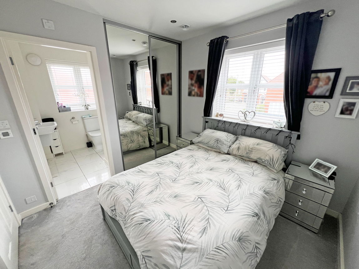 The first-floor landing provides access to all three bedrooms, with the master bedroom featuring its own en-suite shower room, as well as a family bathroom comprising a panel bath with a shower over, a wash-hand basin, and a low-level flush WC.