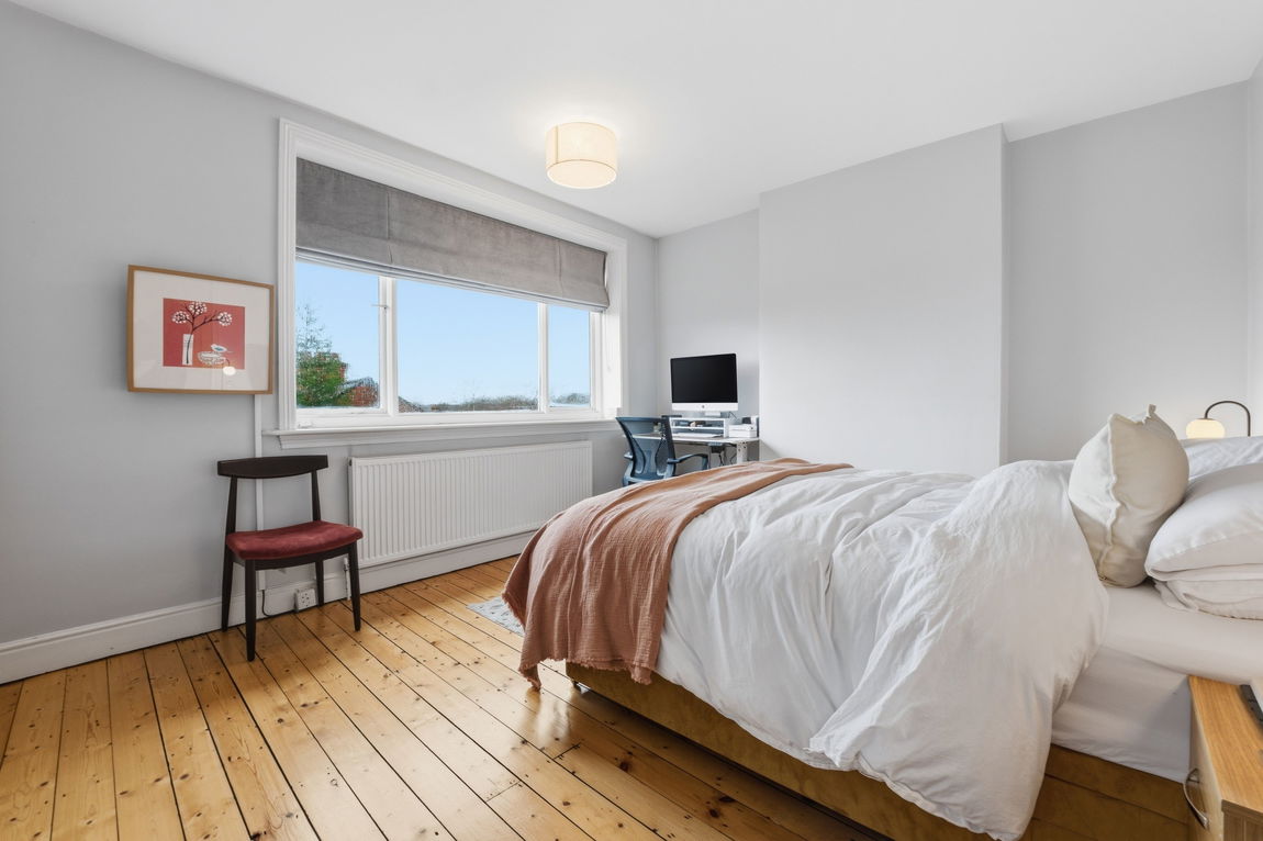 Moving upstairs, you’ll find two well-sized bedrooms, both showcasing the same lovely stripped-back flooring that enhances their charm. The bright main bedroom features a large window that allows natural light to fill the space, along with built-in wardrobes for convenient storage. The second bedroom serves as a comfortable retreat, perfect for guests or family.