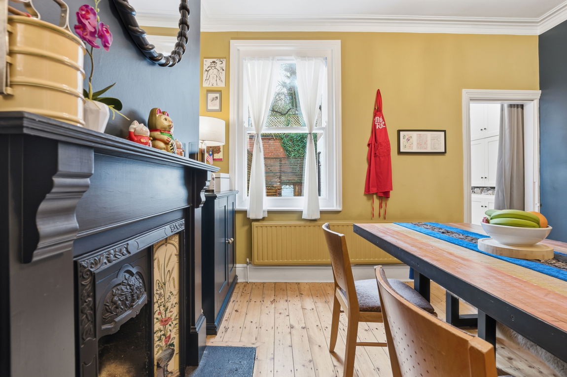 The entrance hall features charming stripped-back flooring that continues throughout the lounge, dining room, and upstairs landing, adding a touch of character to the home. The cosy lounge is enhanced by a beautiful bay window with internal shutters and an open fire, creating a warm and inviting ambiance. The adjacent dining room, also featuring an open fire, provides an excellent space for enjoying meals with family and friends.