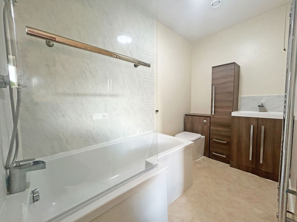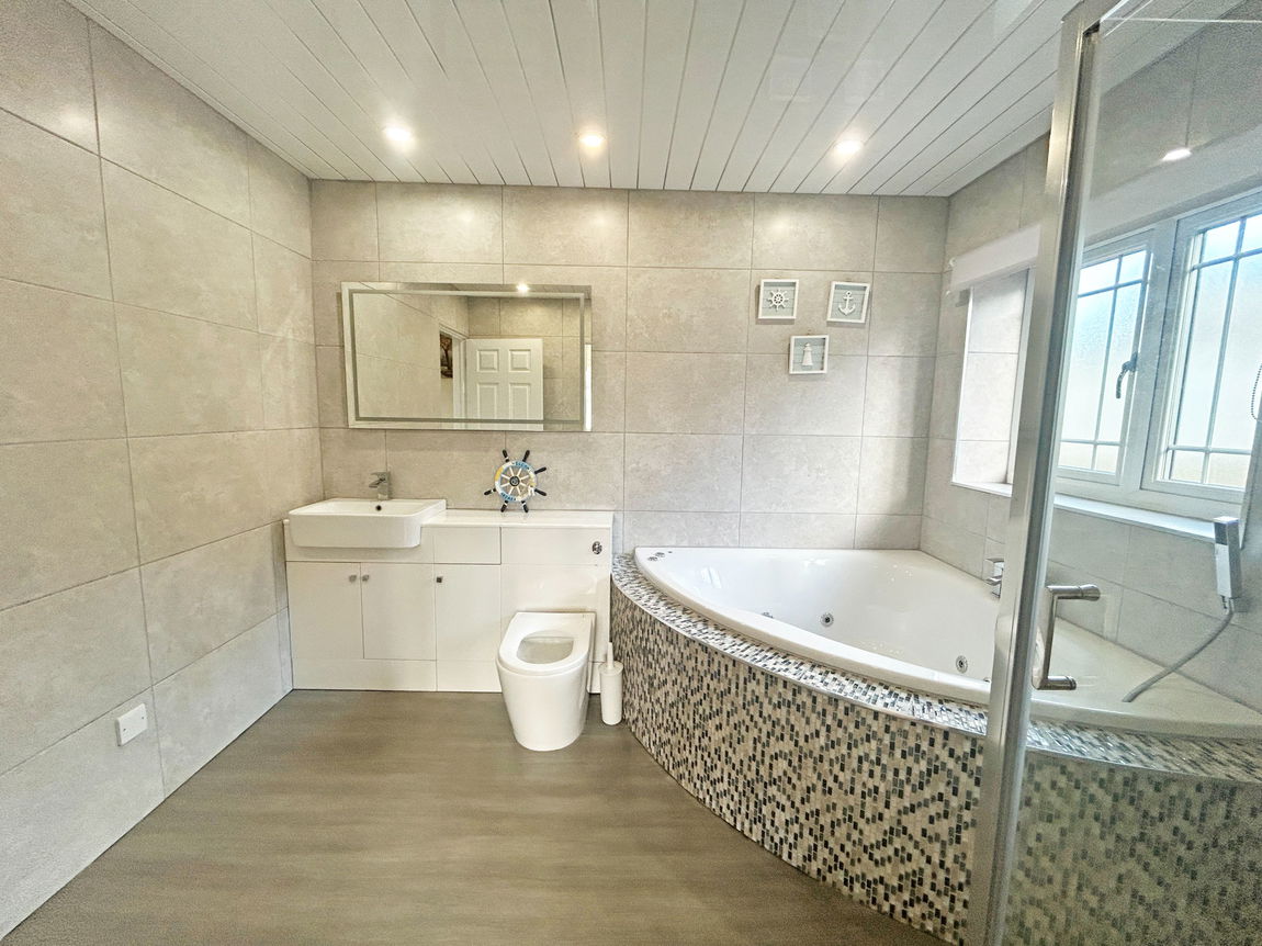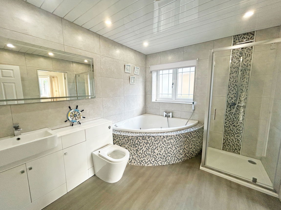 Bathroom: 3.07m x 2.57m (10'1" x 8'5"), Being tiled and having been refitted with a four piece white bathroom suite comprising corner bath with mosaic tiled surround and mixer tap/shower attachment, hand basin set in vanity unit with toilet cupboard under, glass shower cubicle with mosaic tiled back and double-headed mixer shower, close coupled WC, cushion vinyl floor covering, ceiling spotlights, door to main entrance hall and Jack and Jill style connecting door to bedroom one.