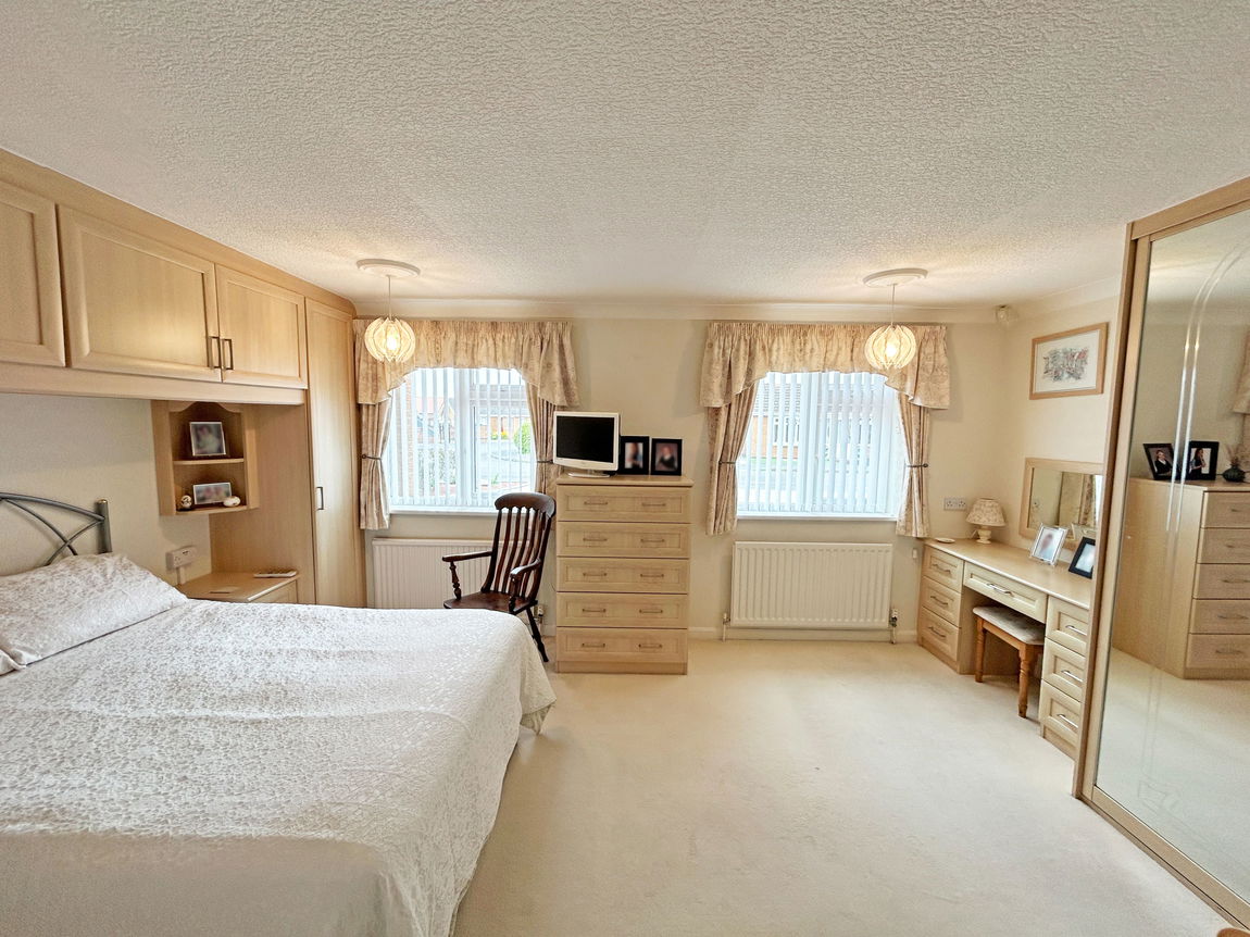 Bedroom One: With two UPVC windows to the front elevation, two radiators, coving to the ceiling, around the bed fitted wardrobes and bedside cabinets, mirror fronted double wardrobe and dressing table.
