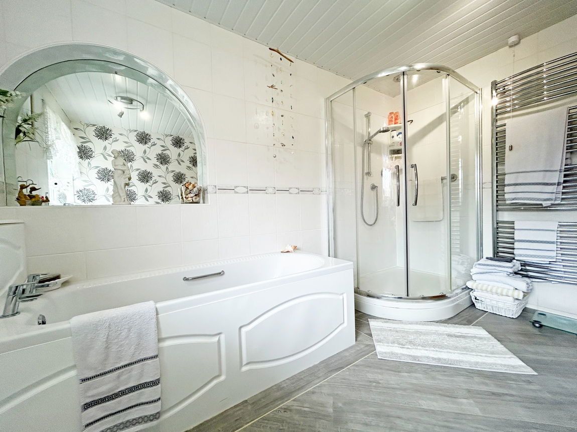 Family Bathroom: With UPVC window to the rear elevation, panelled ceiling, tiled walls, karndean flooring, chrome effect heated towel rail, large shower enclosure with mains fed shower, panel bath, concealed system WC and vanity wash hand basin.
