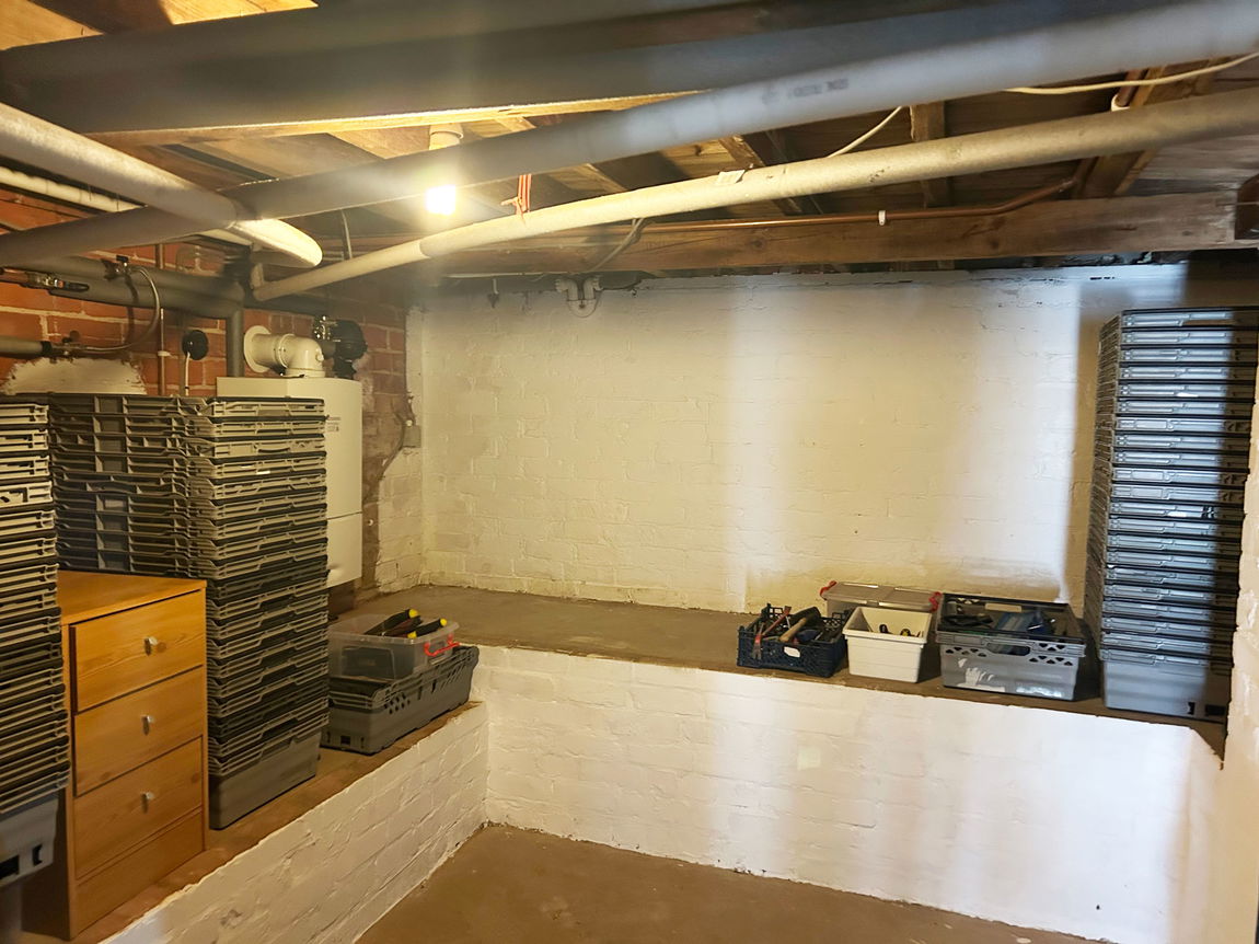 Cellar – 21’11 x 19’04 – Lighting and electricity connected, concrete floor and wall mounted gas fired central heating boiler.