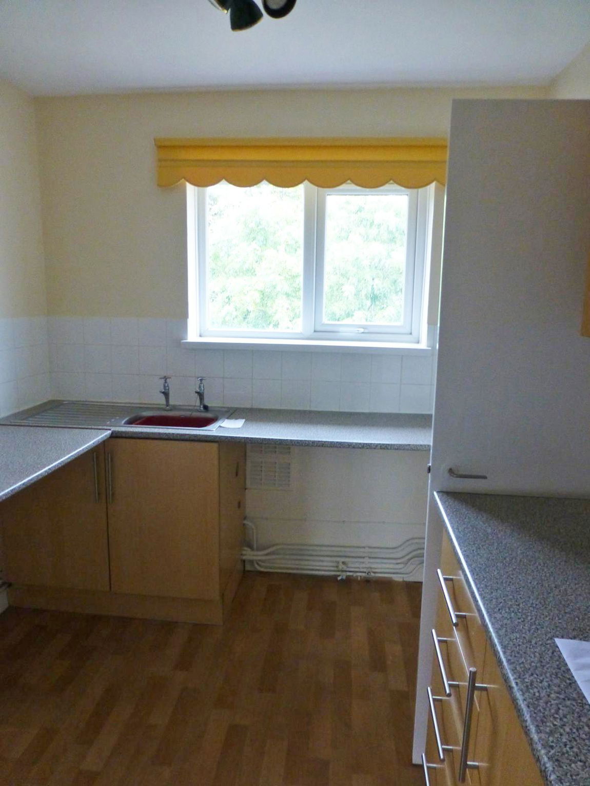 FITTED KITCHEN - With window, having wall mounted units, electric cooker point, stainless steel sink unit, base cupboards and drawers, part tiled, plumbing for automatic washing machine.