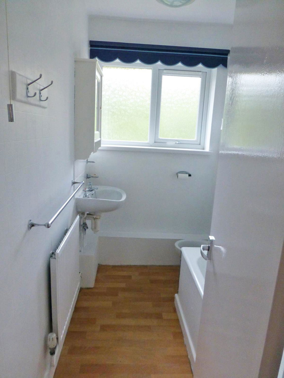 BATHROOM - With panel bath having an electric shower above, wash hand basin, wc, radiator and window.