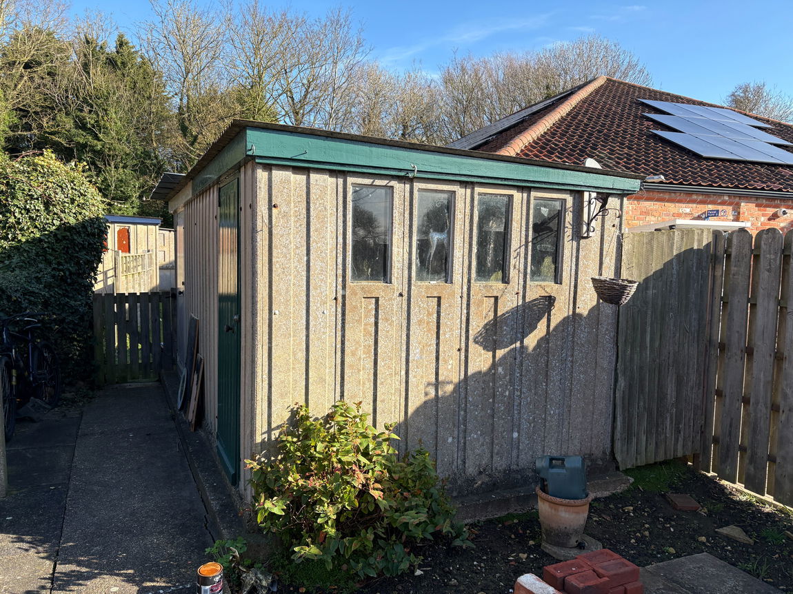 OUTSIDE - To the side of the property is a garden which is mainly laid to lawn with flower bed, along with a paved patio area, To the rear of the garden is a concrete sectional constructed shed measuring 8’01 x 7’10 with timber door.