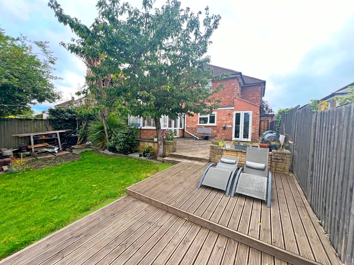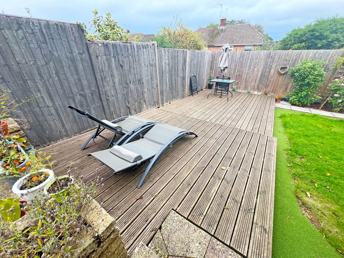 Outside to the rear is a slabbed patio, decking area, and lawn, with wood panel fencing surrounding it.