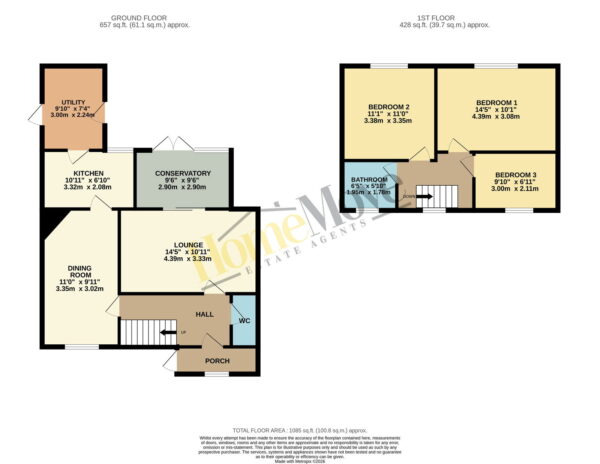 The accommodation is entered via a UPVC door into the entrance porch which has a glazed door giving access to the entrance hall. The hall has stairs rising to the first floor a downstairs WC and doors leading to. The lounge, which has sliding patio doors leading to the conservatory. The conservatory has French doors giving access to the rear garden. The separate dining room has wood effect flooring, a window to the front elevation and a door leading to the kitchen. The kitchen is fitted with a range of wall and base units, stainless steel sink and drainer with a mixer tap, gas cooker point, window overlooking the rear garden and a glazed door leading to the utility store. The utility store offers a useful storage area and currently houses a fridge/freezer and tumble dryer.