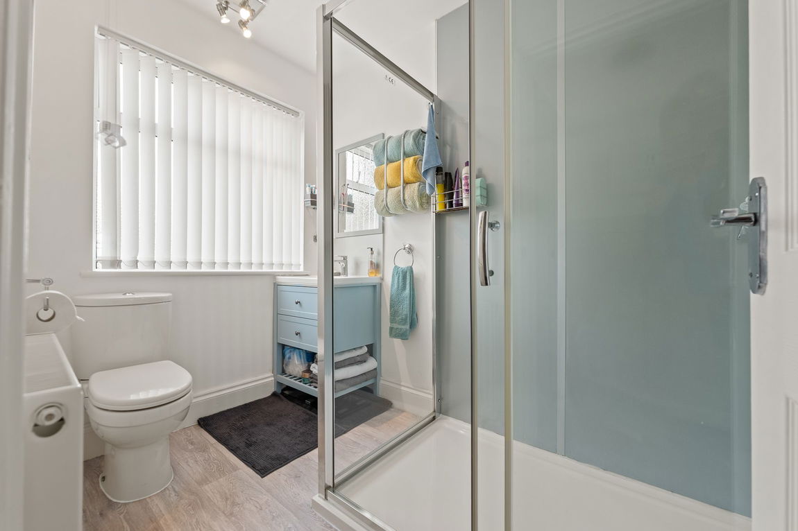 Both bedrooms provide generous proportions, allowing for restful nights and rejuvenating mornings. The main bedroom, positioned at the front, features an elegant bay window that bathes the space in natural light, while the second bedroom, located at the rear, offers two double-glazed windows that enhance the tranquil atmosphere. The bathroom is a true sanctuary, featuring a modern three-piece suite complete with a walk-in shower—a perfect retreat for unwinding after a long day.