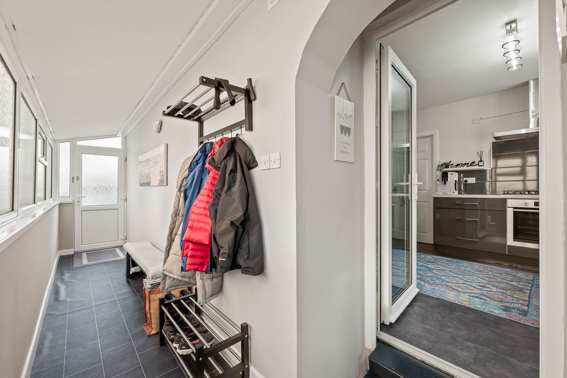 Practicality meets charm with the addition of a side porch accessible from the kitchen, offering a seamless bridge between the indoor and outdoor spaces. This delightful feature allows easy access from the front and rear of the property, enhanced by double-glazed windows that invite ample light. A conveniently placed utility area off the porch provides plumbing for a washing machine and tumble dryer, along with space for an additional fridge or freezer, ensuring that chores are handled with ease.