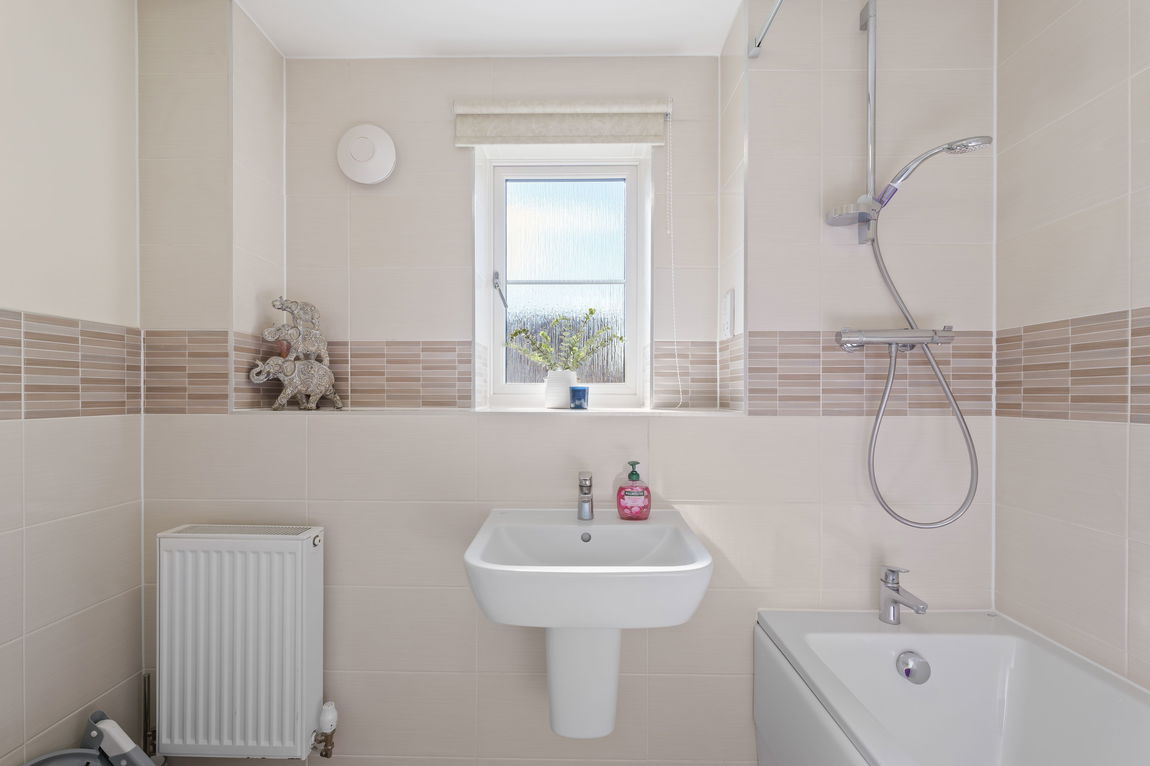 Up on the first floor the landing provides access to three bedrooms and the bathroom. The principal bedroom has a window overlooking the side, a built-in wardrobe and an en-suite with a toilet, wash basin and a shower enclosure with a mains fed shower. Bedrooms two and three are similar in size with one having a window overlooking the garden at the side, the other a window overlooking the front. The bathroom is fitted with a bath with a mains fed shower over it, a toilet and a wash basin.