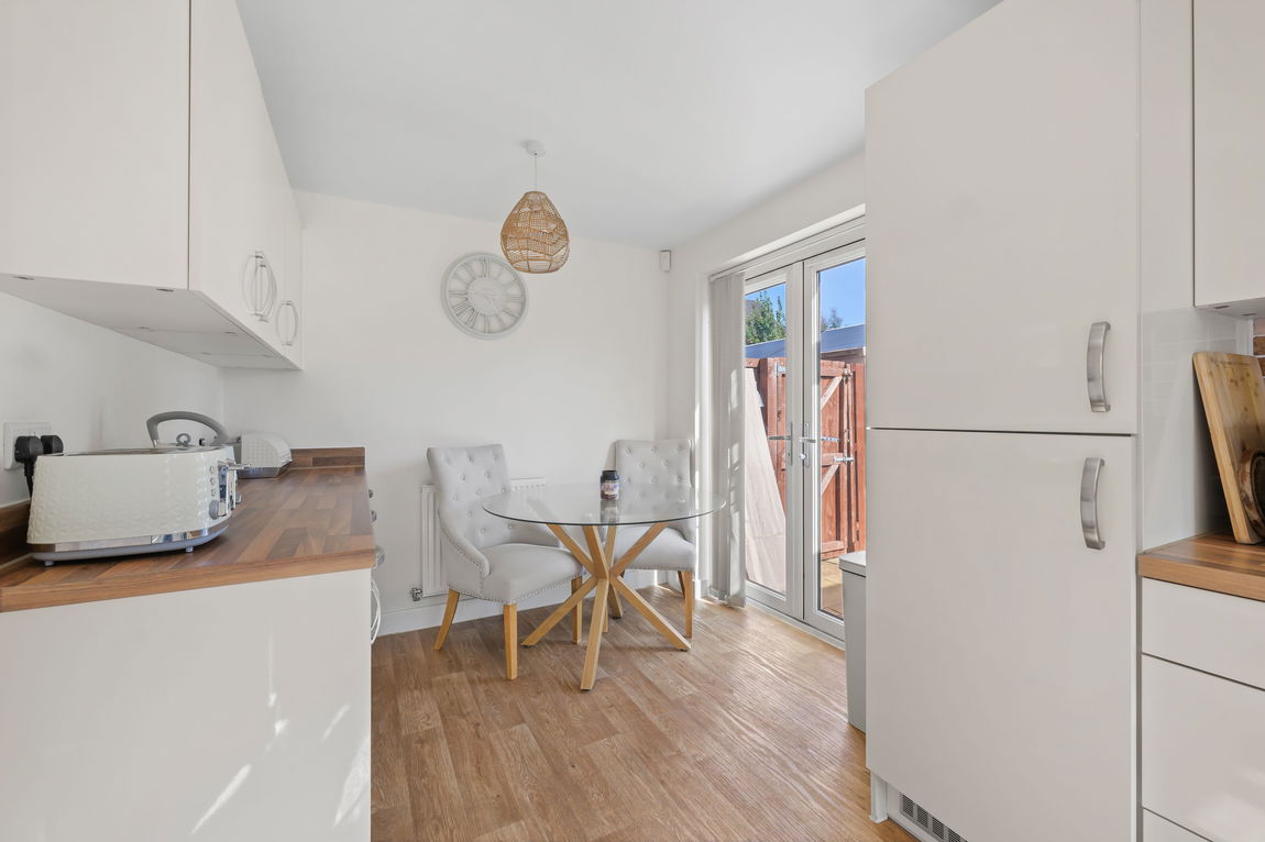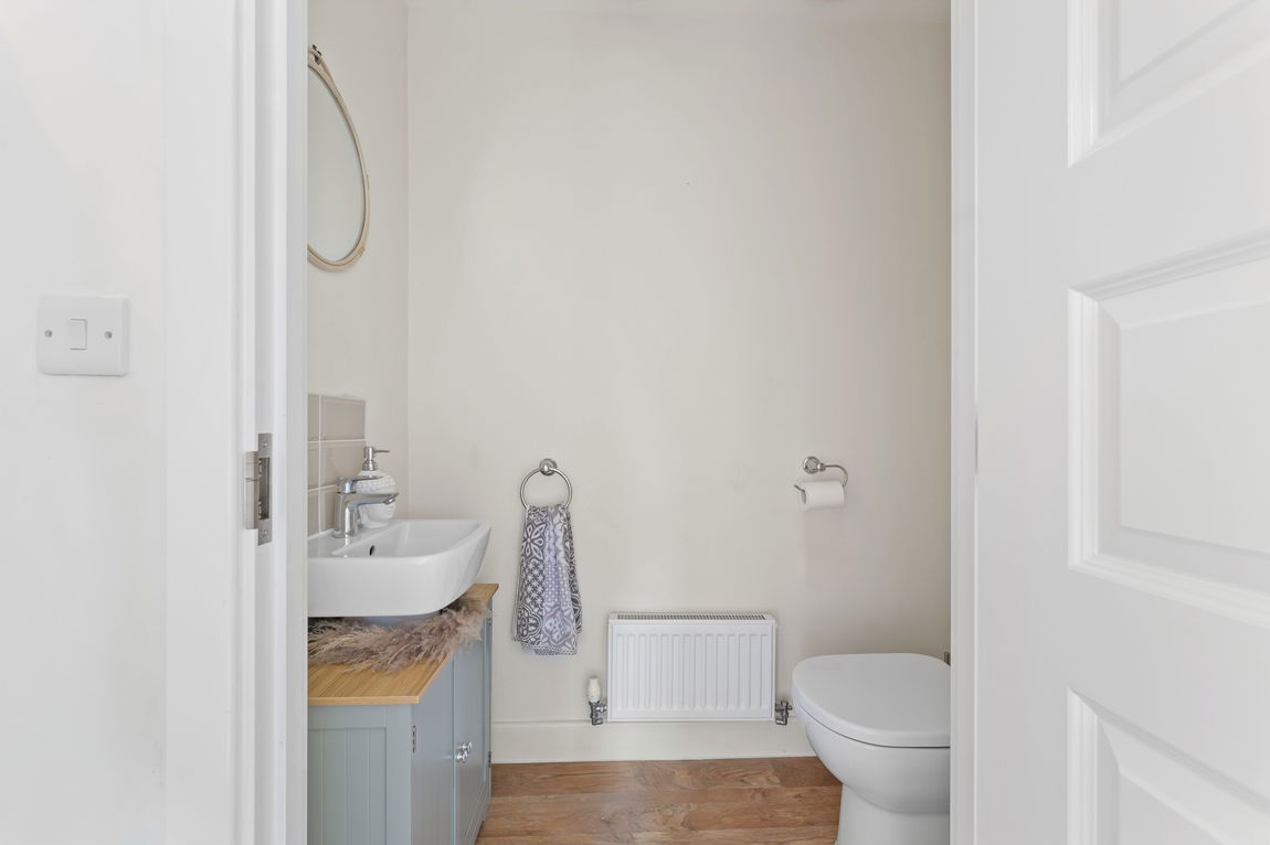 The accommodation is presented to a high standard and set out over ground and first floors. The front door opens into the entrance hall where a staircase, with underneath storage, rises to the first floor and there are doors that provide access into the lounge, kitchen/diner and an extremely useful ground floor cloakroom with toilet and wash basin. The dual aspect lounge is well-proportioned and has a lovely feature bay window overlooking the side of the property. The impressive kitchen/diner extends to 16’9 (5.17m), has a window overlooking the front and french doors that open to the garden. It is fitted with a contemporary range of cupboards that incorporate a built-in oven and a gas hob with an extraction unit above it. There’s an integrated fridge, freezer and dishwasher and space and plumbing for a washing machine.