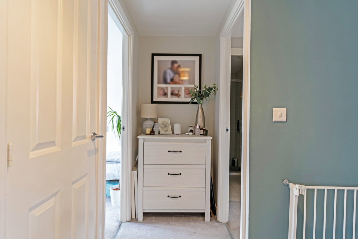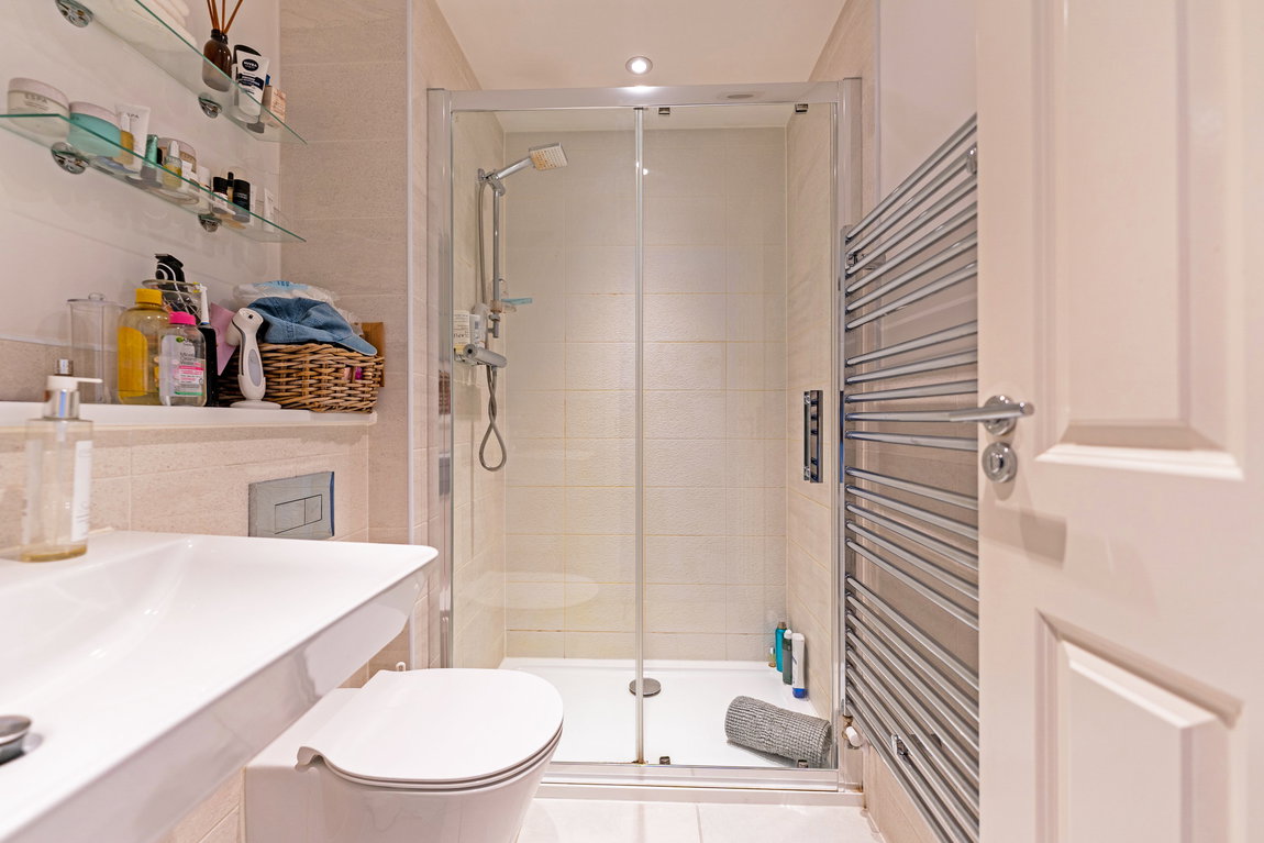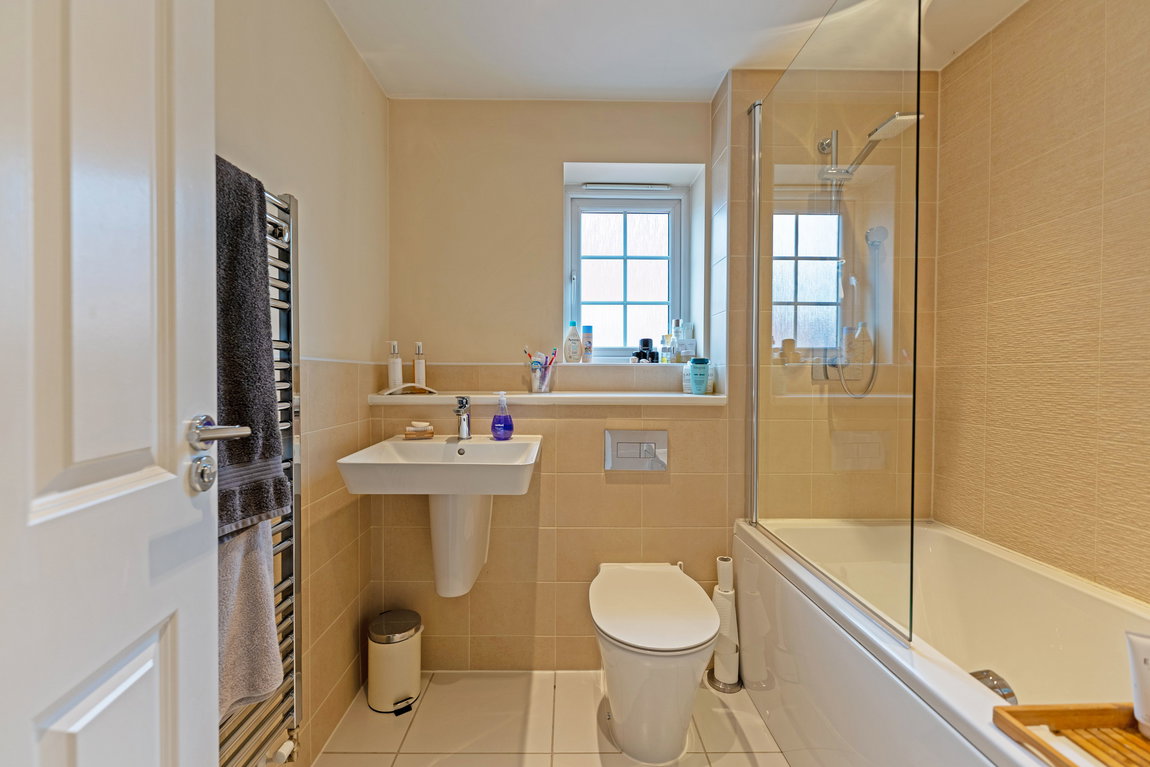 The first floor offers four generously proportioned double bedrooms, each well appointed. The main bedroom is particularly impressive, featuring contemporary fitted wardrobes and a luxurious en suite shower room. A stylish family bathroom with matching modern sanitaryware serves the remaining bedrooms, and the landing gives access to both roof storage and a deep built-in cupboard.