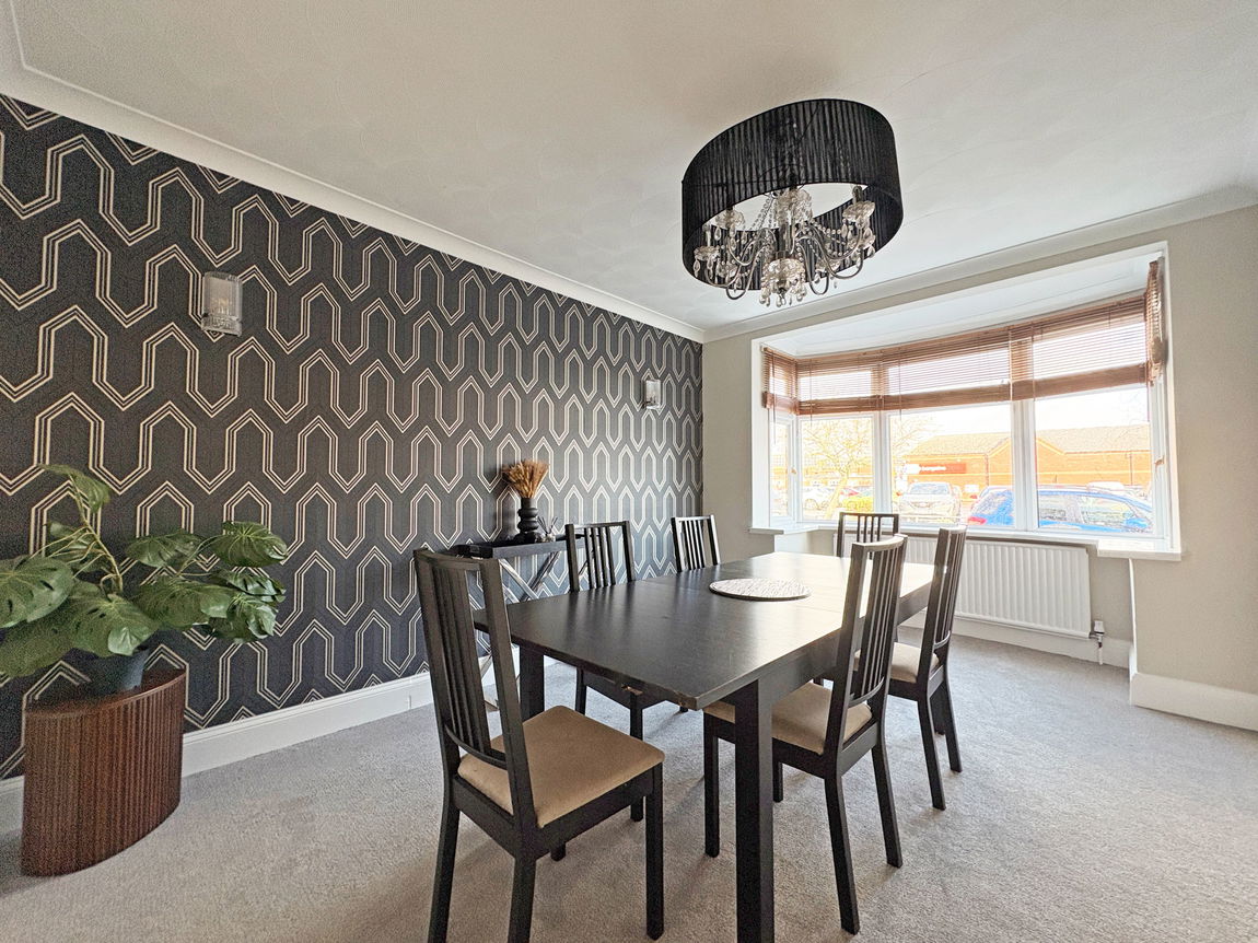 Dining Room: Having bay window to the front, radiator, texture and coving to the ceiling, television point, wall light points.