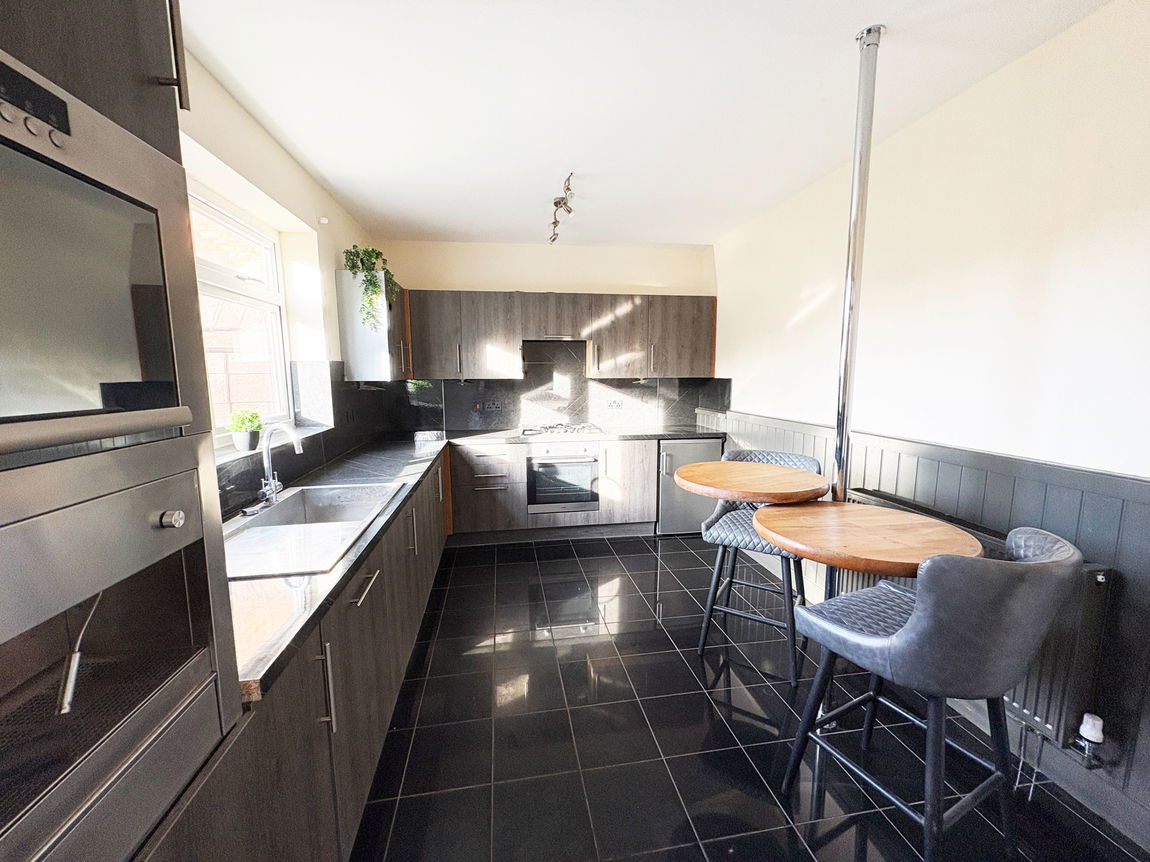 Fitted Kitchen: Having window unit to the rear elevation, electric fuse box, radiator, part panelled walls, tiled floor, fitted kitchen units comprising base cupboards, drawers and wall mounted units, working surface, tiled splashback, insert sink with mixer tap, space for under counter fridge, five ring gas hob with oven below, extractor above, fitted appliances to include coffee machine, microwave, dishwasher and washing machine.