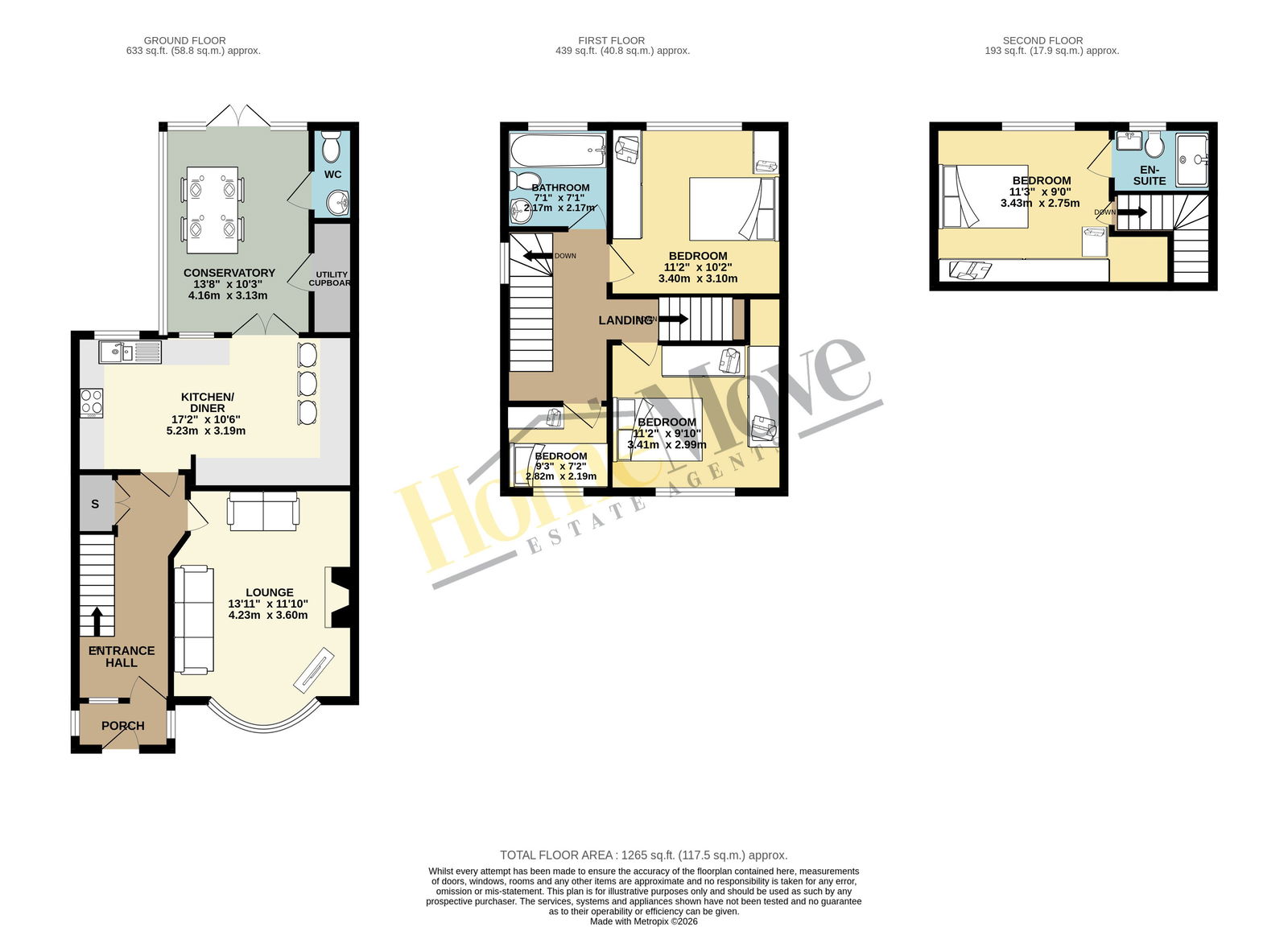Deceptively spacious and well-presented accommodation is set out over ground, first and second floors. The front door opens to a porch, ideal for the storage of coats and shoes. In turn, this leads to the entrance hall where a staircase rises to the first floor and doors provide access into the lounge and kitchen/diner. The lounge has a cosy, homely feel to it and an electric log burner style fire that forms an attractive focal point to then room. The kitchen/diner is fitted with a traditional style range of cupboards and leads to the conservatory, currently used as a dining room. There’s access here to a useful guest cloakroom with toilet and wash basin and to an equally useful utility cupboard with plumbing for a washing machine.