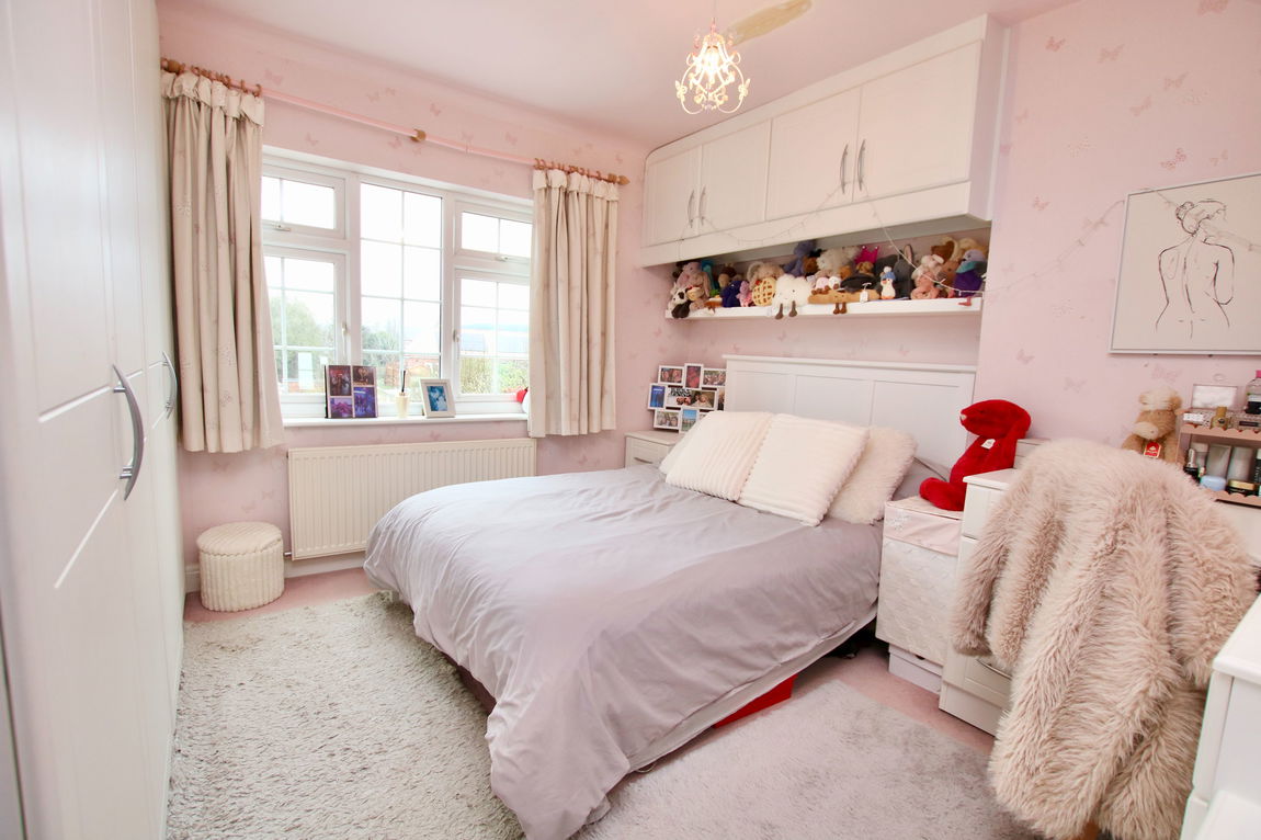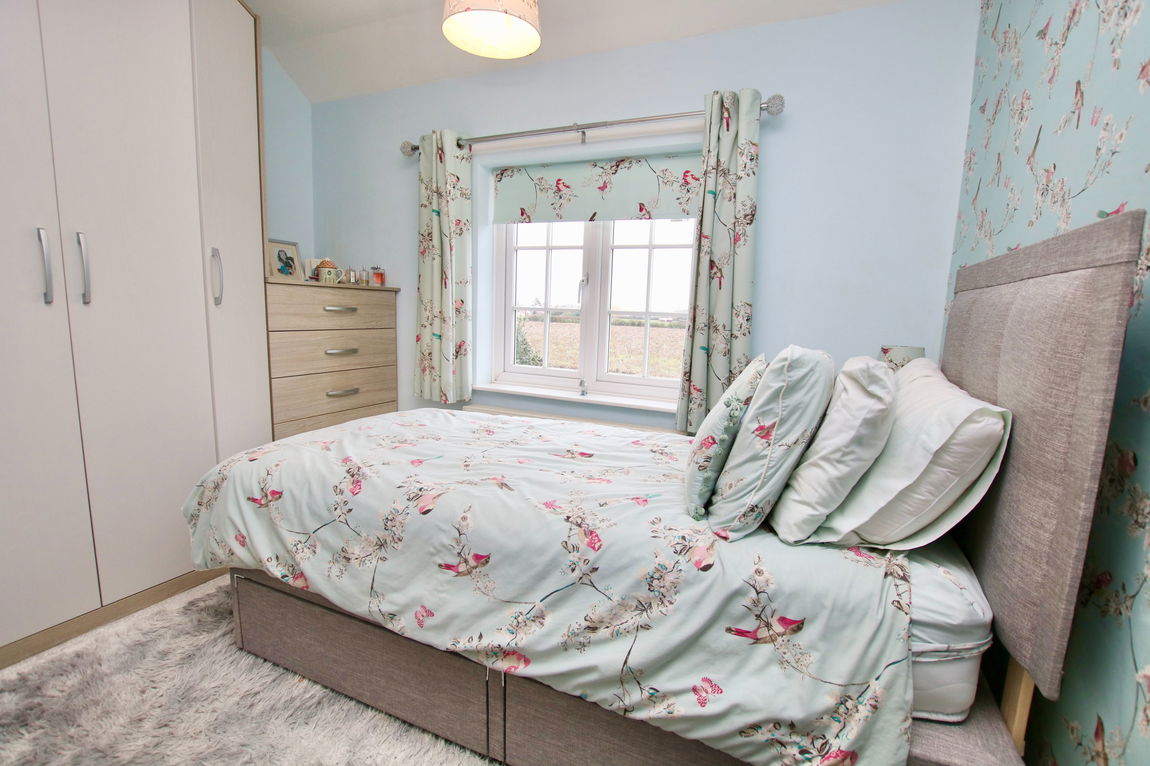 Up on the first floor, there are three bedrooms; two overlooking the fields opposite and one with an outlook over the rear garden. All three bedrooms have fitted wardrobes. The bathroom is fitted with a stylish suite comprising of a bath with a shower fitting over it, wash basin and toilet.