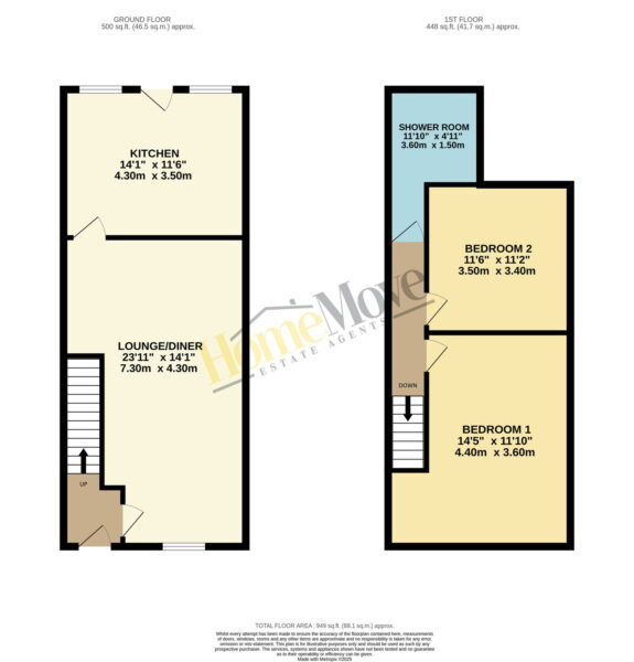 The accommodation comprises a hallway, an open-plan lounge-diner, an extended kitchen, two bedrooms, and a family shower room.
