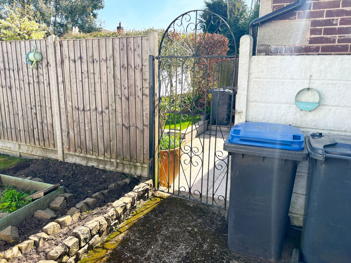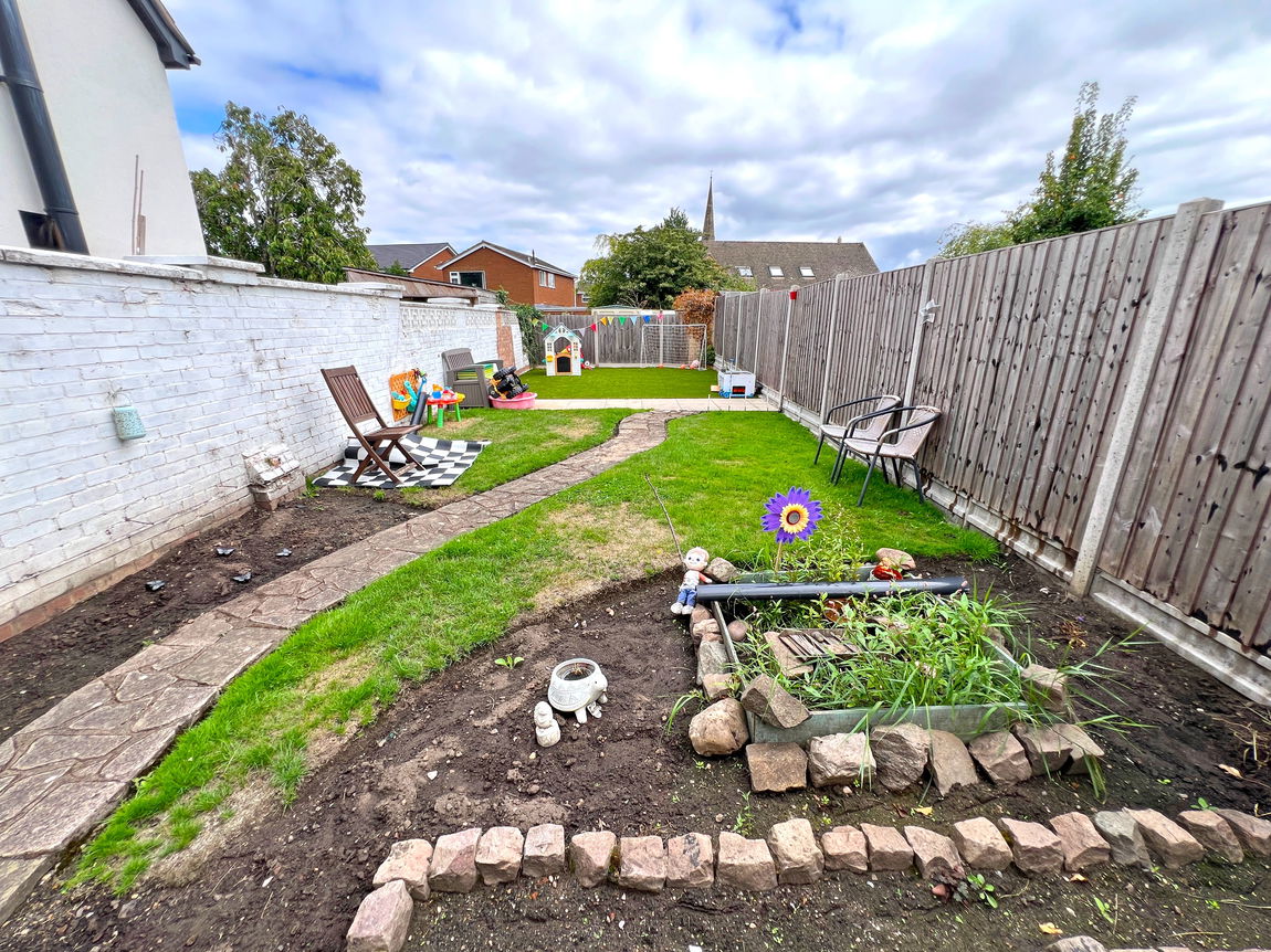 Outside, to the rear, there is a slabbed path around lawned areas with a further artificial lawn area at the very rear.