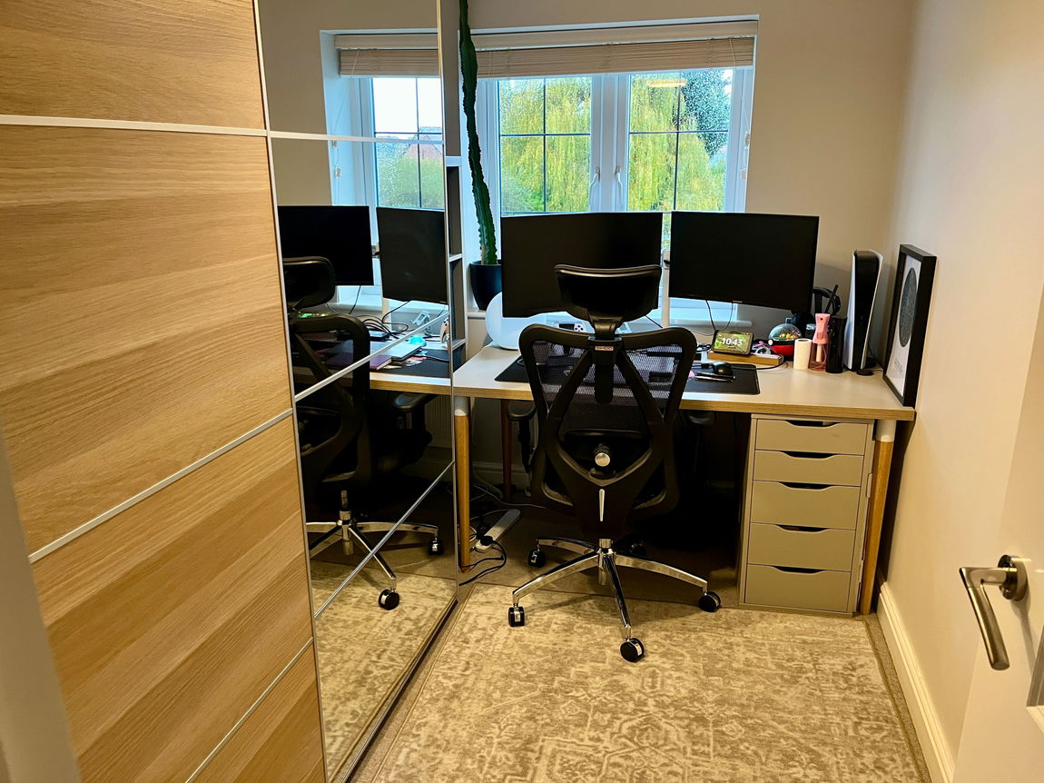 The office/playroom has a window overlooking the front elevation and wood effect flooring.