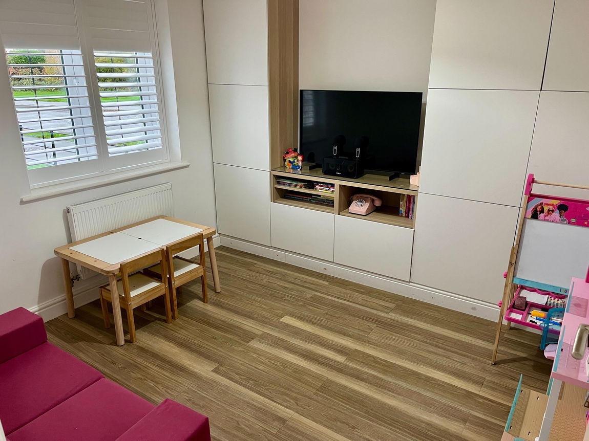 The lounge has a window overlooking the front elevation, wood effect flooring, bespoke built in storage and French doors leading to the rear garden.