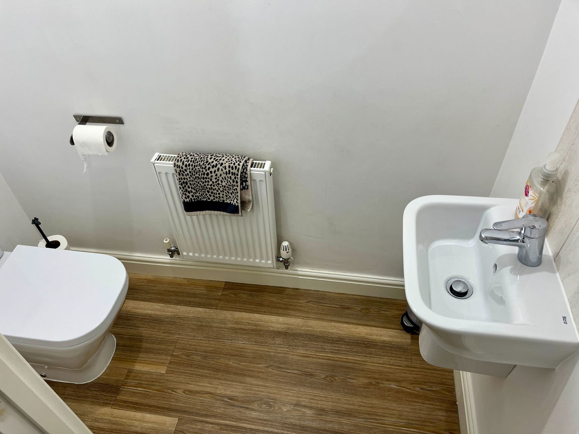 The downstairs WC has a low-level WC, wall mounted wash hand basin and wood effect flooring.