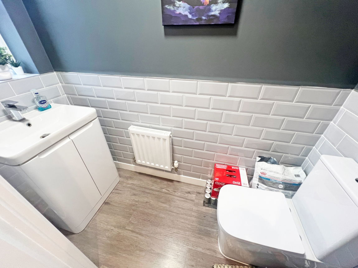 The first-floor landing provides access to both bedrooms, and there is a family bathroom comprising a panel bath having a shower screen and a shower over, a wash hand basin, and a low-level flush WC.