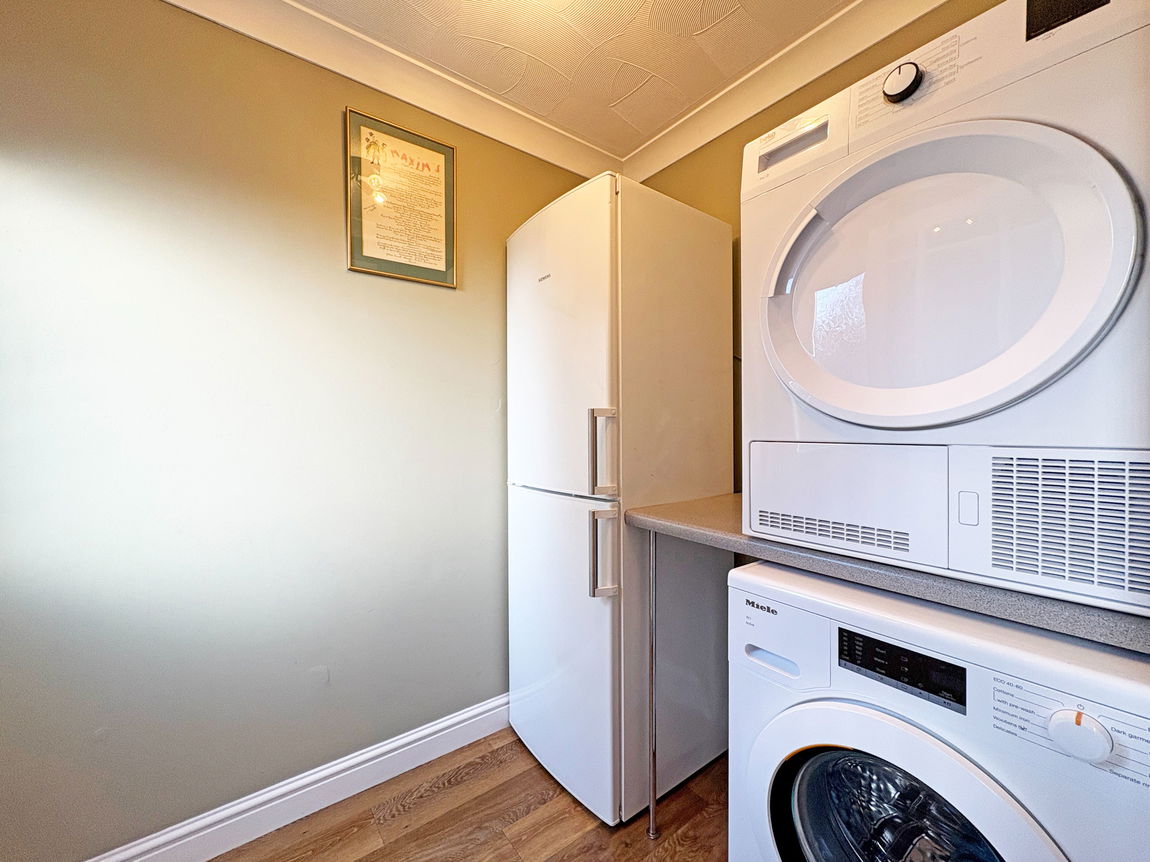 Utility: Having timber and glazed entrance door, Karndean flooring, texture and coving to the ceiling, space for fridge freezer, work top, extractor and space and plumbing for automatic washing machine,