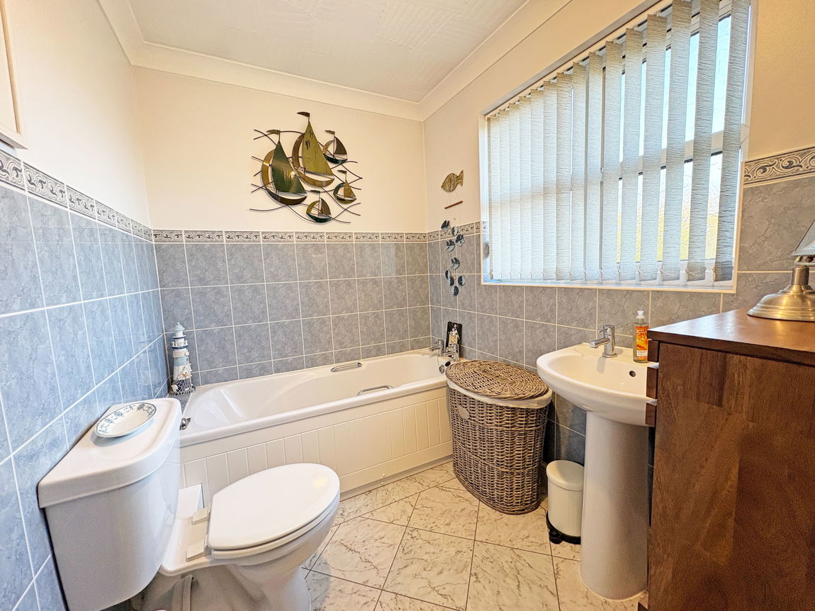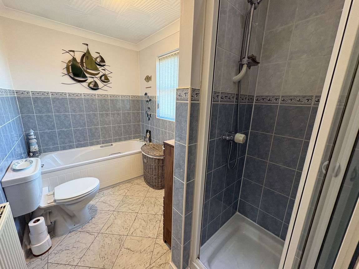 Bathroom: Having window, tiled floor, part tiled walls, walk in shower enclosure with shower, radiator, texture and coving to the ceiling, low level flush wc, wash hand basin, panel bath.