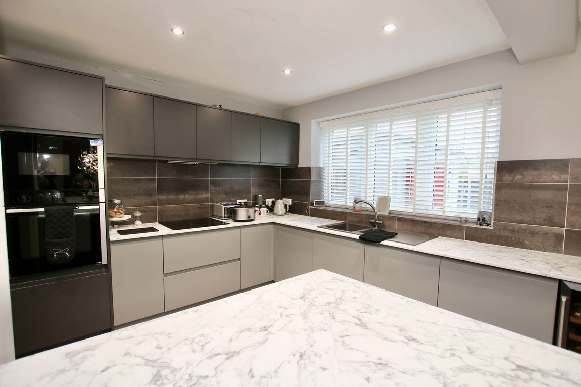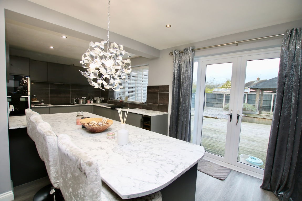Accommodation is set out over ground and first floors and comprises of an entrance hall with stairs to the first floor and a good-sized storage room offering great potential to become a ground floor cloakroom/toilet (we are advised that the plumbing is already in place). The ‘L’ shaped open-concept kitchen/living/dining areas are stunning; with French doors to the rear garden. The refurbished kitchen has a built-in oven, hob and extractor fan and there’s an integrated fridge, freezer and dishwasher. A breakfast bar seats four.