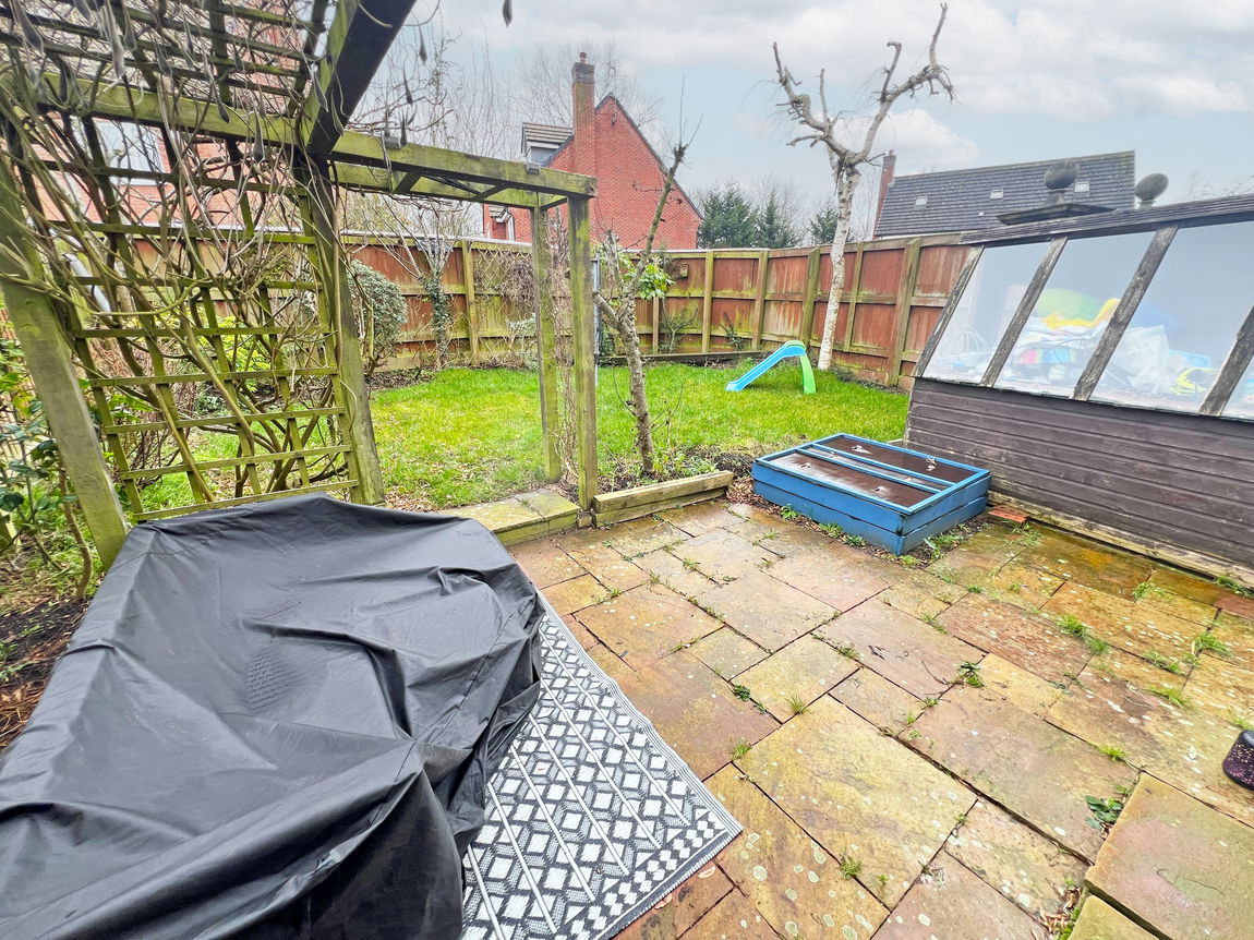 Outside, to the rear, is the garden, featuring a slabbed patio area and a lawn, surrounded by wood panel fencing.